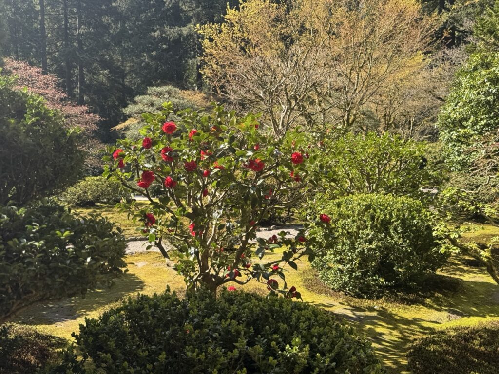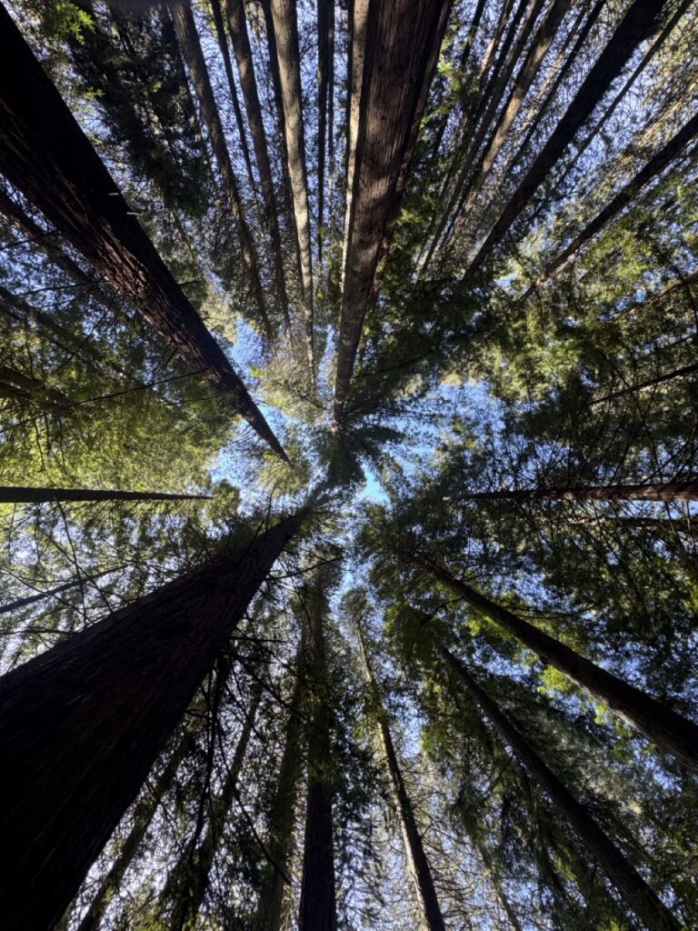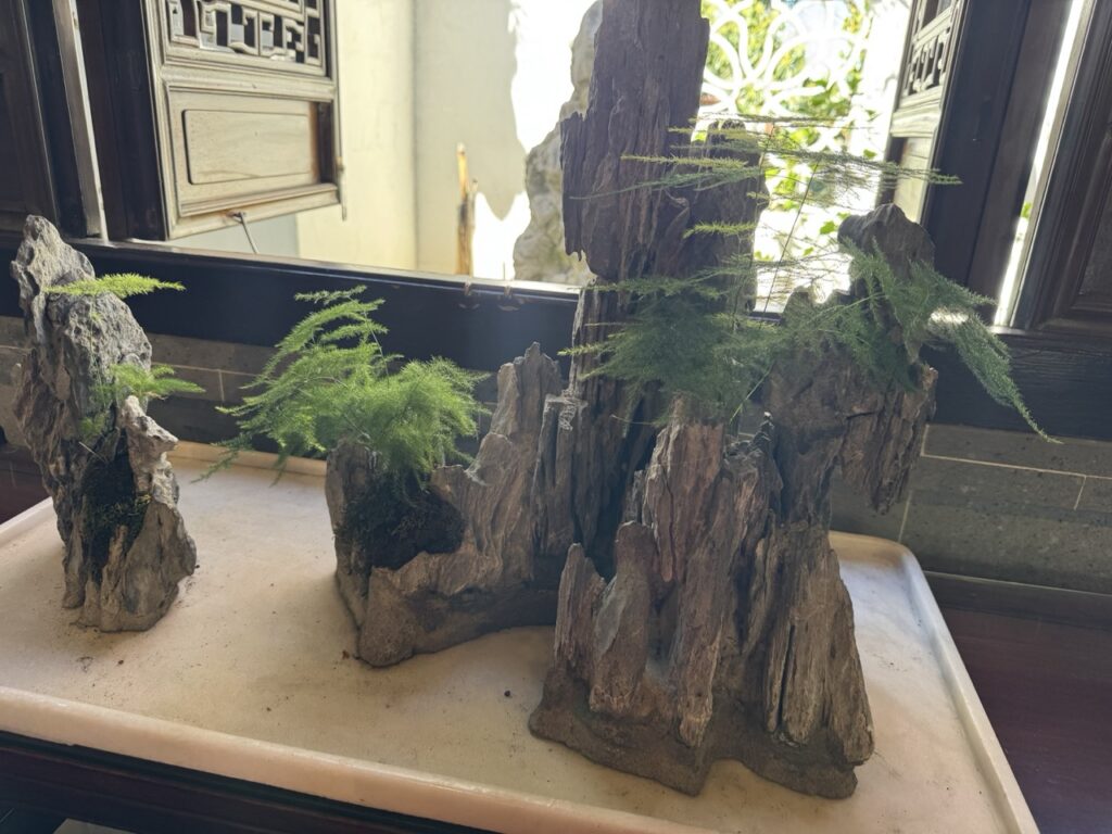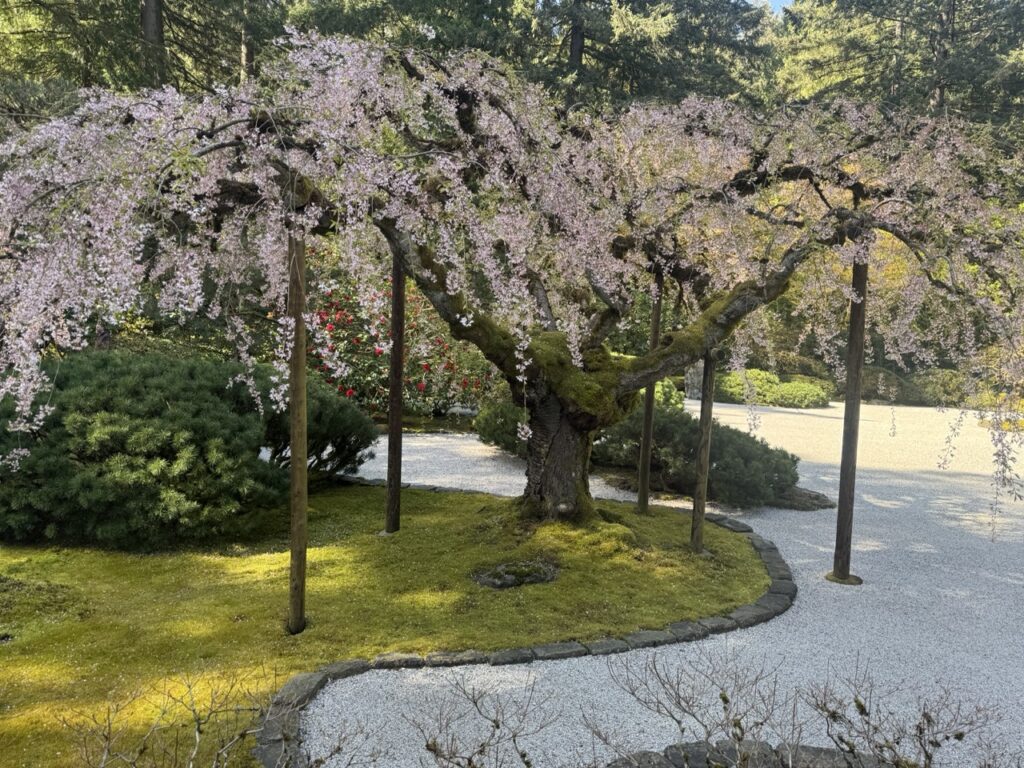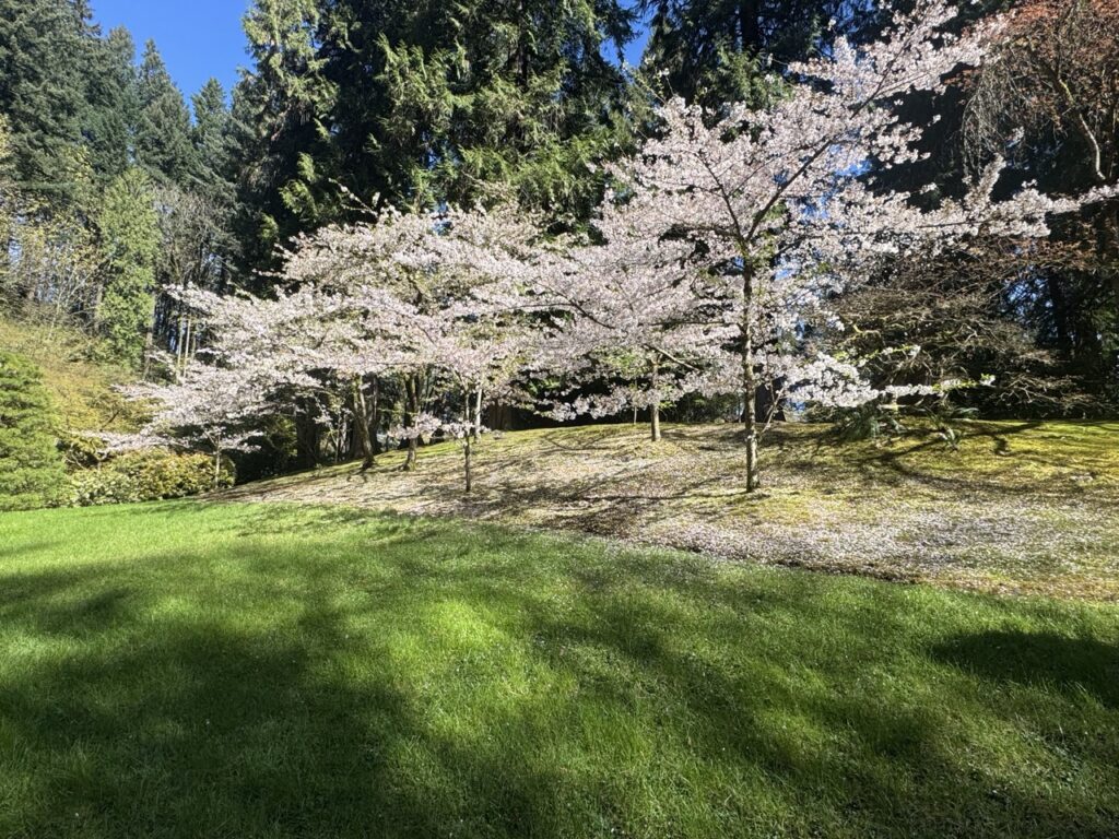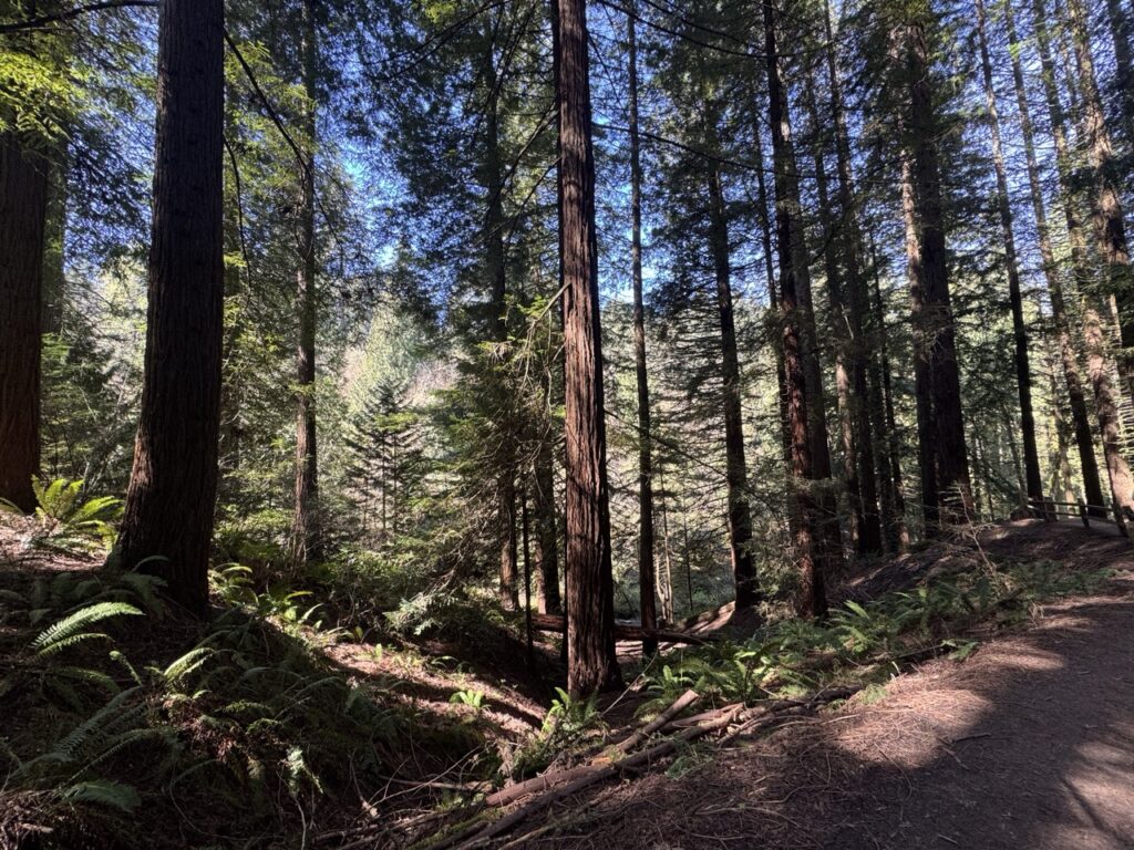 As we shared a week or so ago, recent strong winds were too much for a very tall rudraksha tree clump that has been growing in a low swampy area for decades soon after the Ganesha shrine on San Marga path. The clump was uprooted, but rather than falling all the way down, it got stuck at a 45-degree angle on more rudraksha trees on the other side of the path.