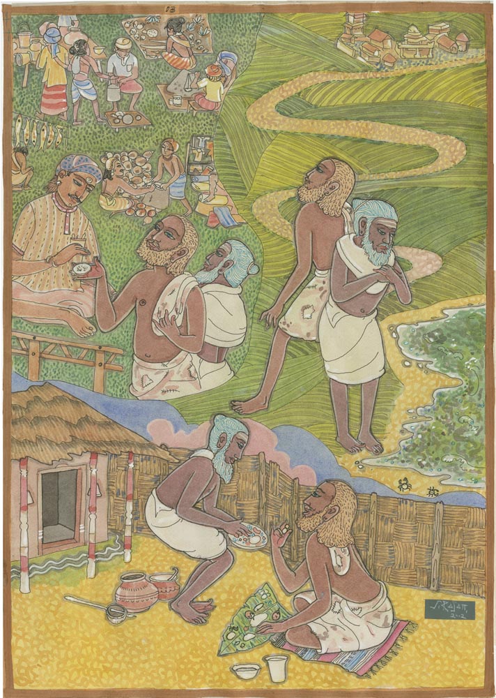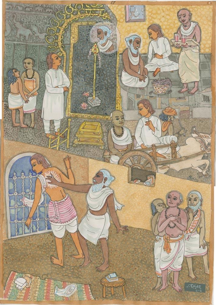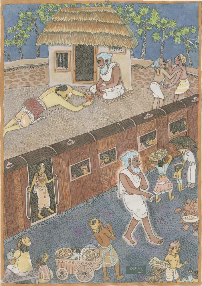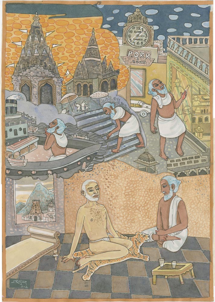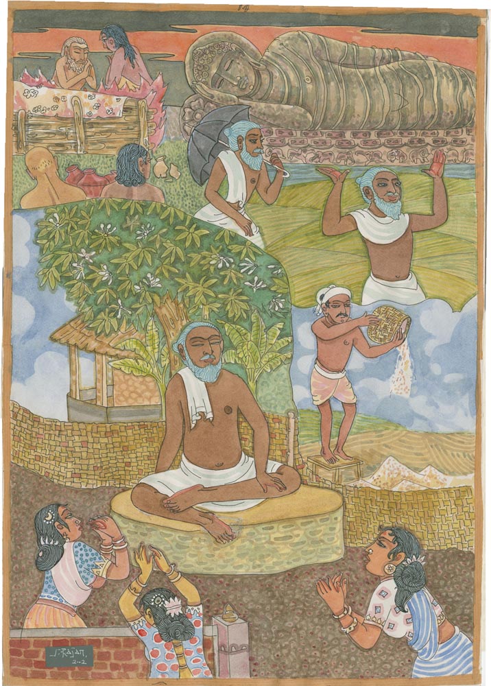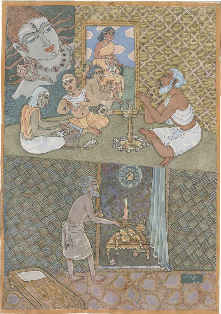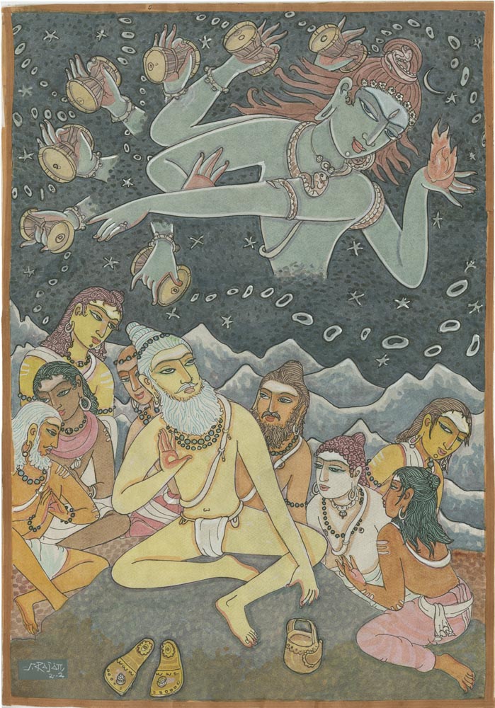 Sundaram Rajam: (10 February 1919 – 29 January 2010) was an Indian actor, painter and Carnatic musician from the state of Tamil Nadu. He is known for his series of portraits of the Trinity of Carnatic music. In the 1990s Himalayan Academy purchased his lifetime of work, some 500 paintings, brought them to Kauai and digitized everything to preserve this amazing spiritual resource. Then for almost 20 years he painted the covers of all our books, a series for The Vedic Experience, Tirukural, sacred symbols and from 2002-2004 the precious illustrations for The Guru Chronicles.