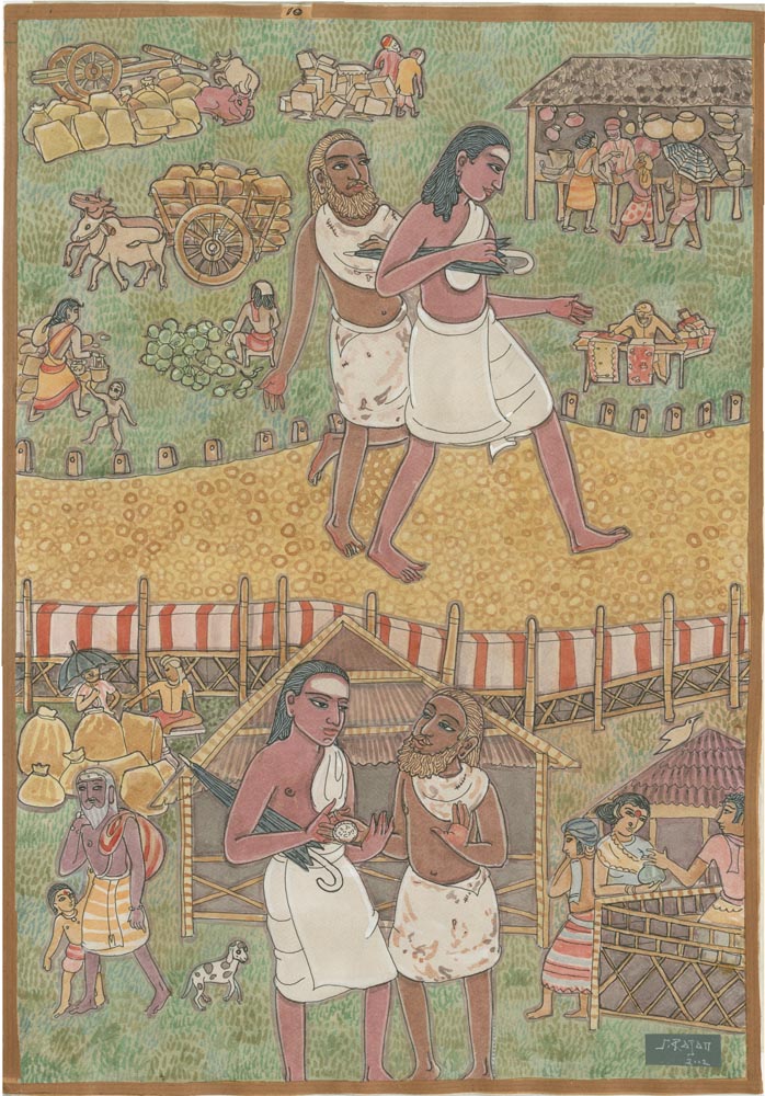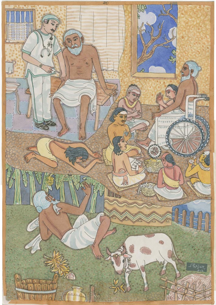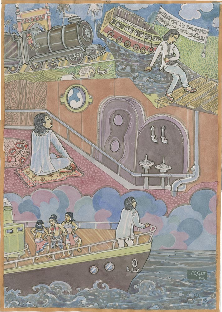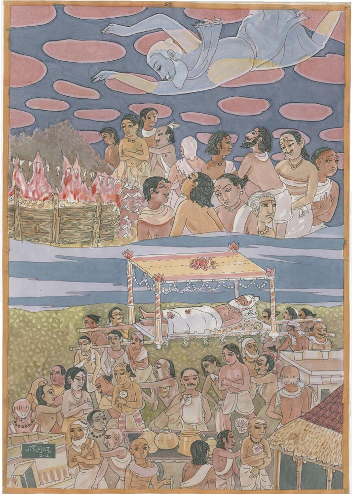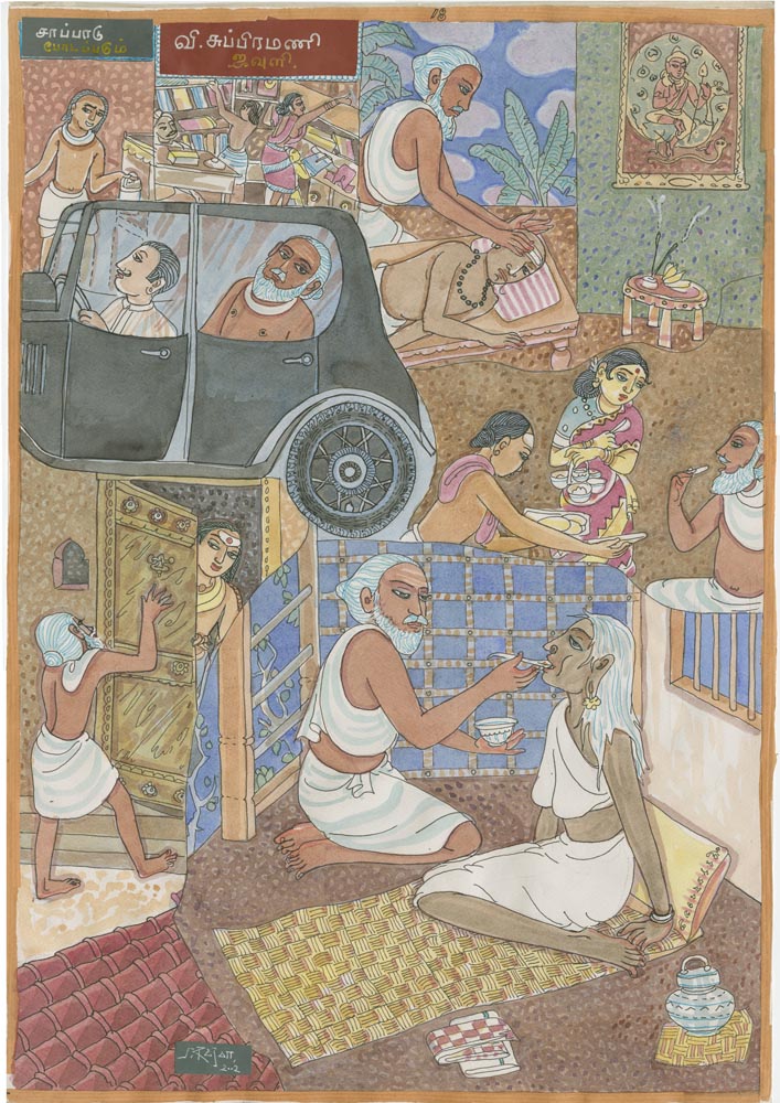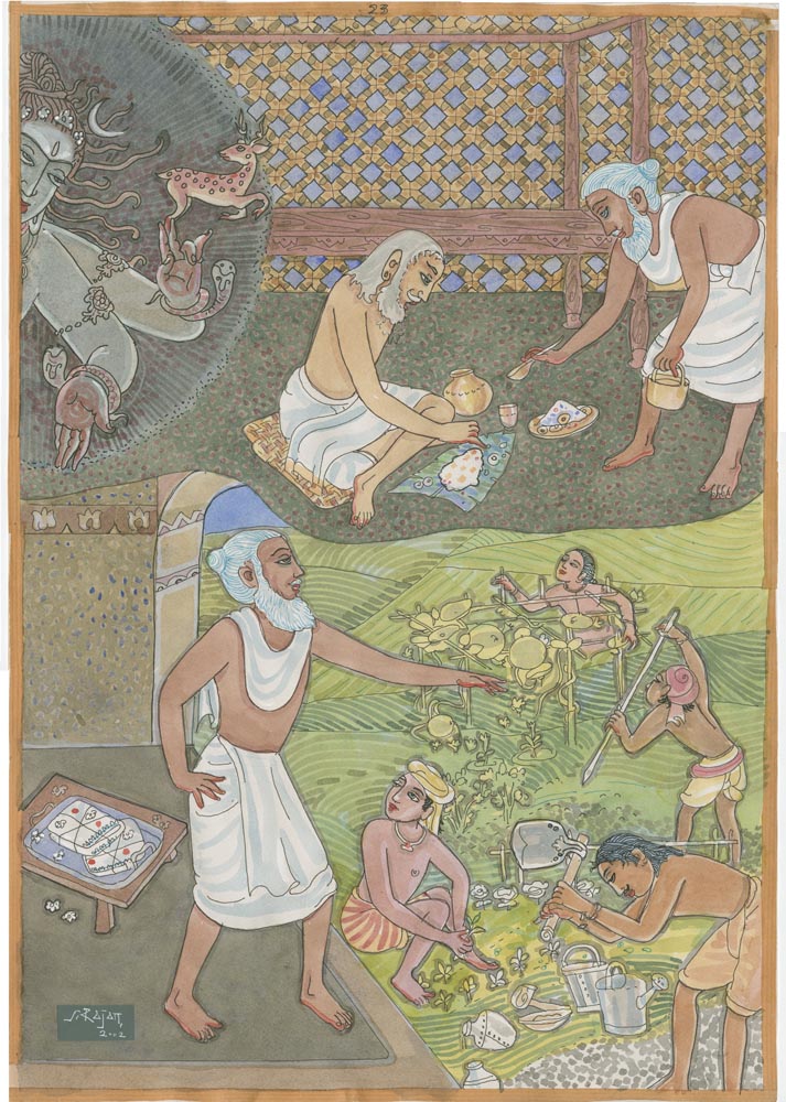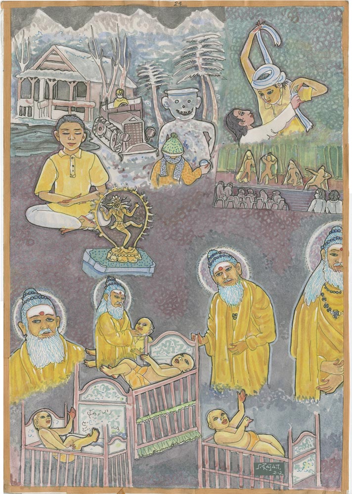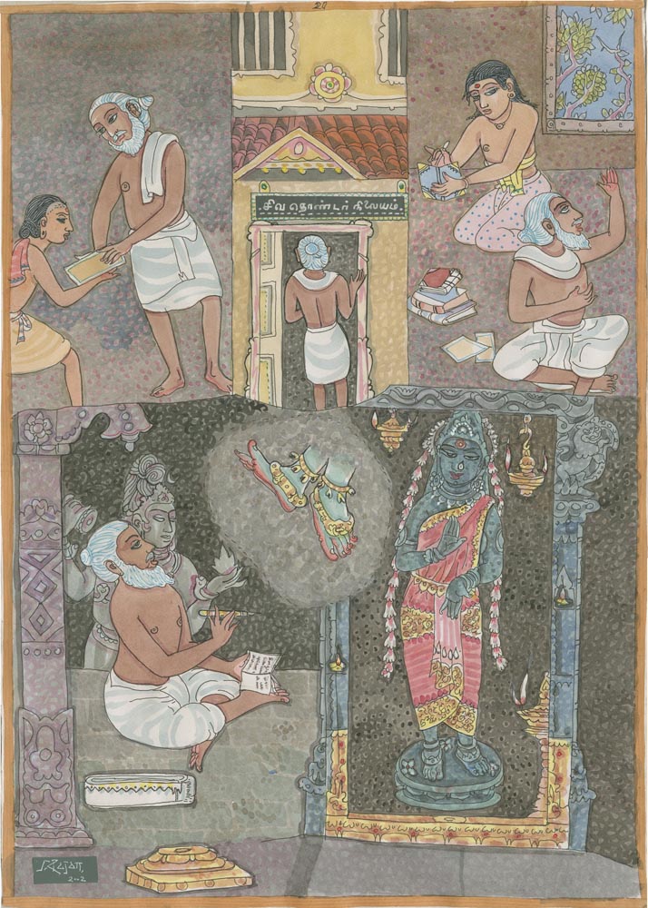 Sundaram Rajam: (10 February 1919 – 29 January 2010) was an Indian actor, painter and Carnatic musician from the state of Tamil Nadu. He is known for his series of portraits of the Trinity of Carnatic music. In the 1990s Himalayan Academy purchased his lifetime of work, some 500 paintings, brought them to Kauai and digitized everything to preserve this amazing spiritual resource. Then for almost 20 years he painted the covers of all our books, a series for The Vedic Experience, Tirukural, sacred symbols and from 2002-2004 the precious illustrations for The Guru Chronicles.
