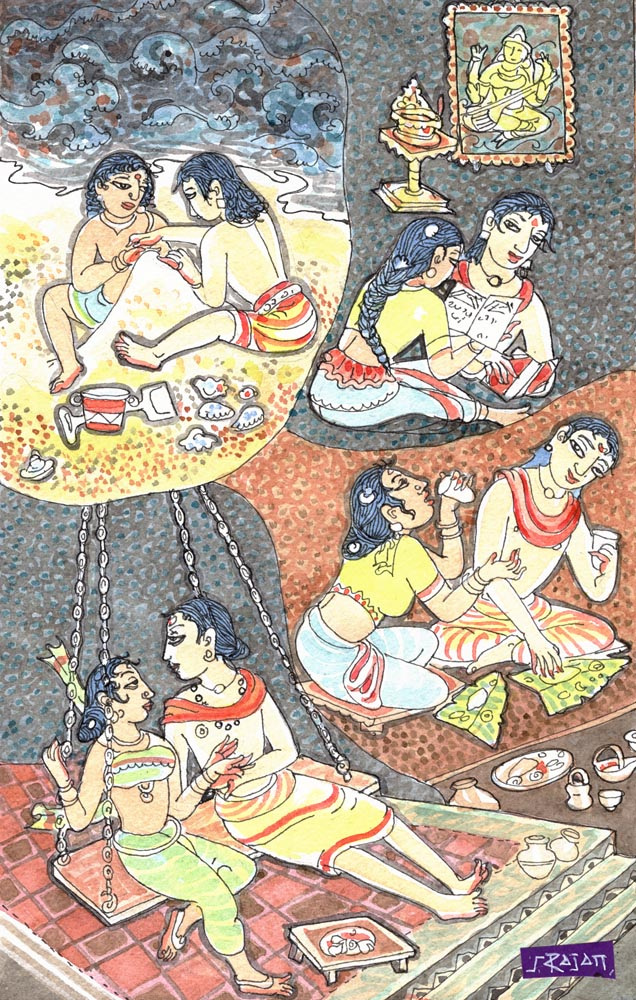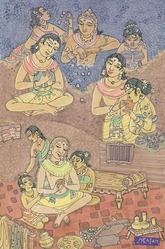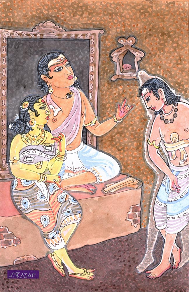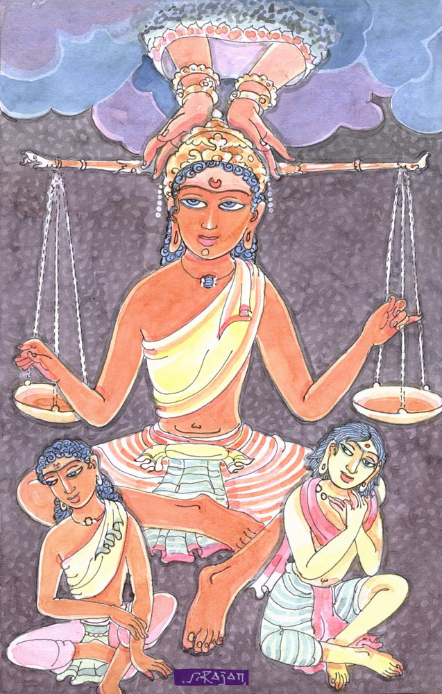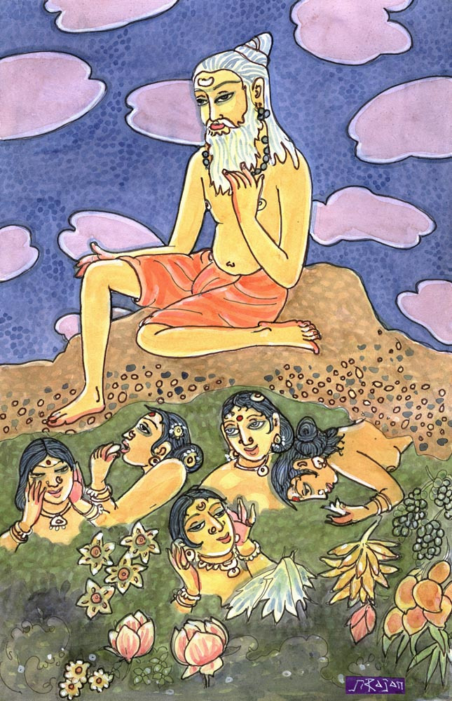 Sundaram Rajam: (10 February 1919 – 29 January 2010) was an Indian actor, painter and Carnatic musician from the state of Tamil Nadu. He is known for his series of portraits of the Trinity of Carnatic music. In the 1990s Himalayan Academy purchased his lifetime of work, some 500 paintings, brought them to Kauai and digitized everything to preserve this amazing spiritual resource. Then for almost 20 years he painted the covers of all our books, a series for The Vedic Experience, Tirukural, sacred symbols and from 2002-2004 the precious illustrations for The Guru Chronicles.