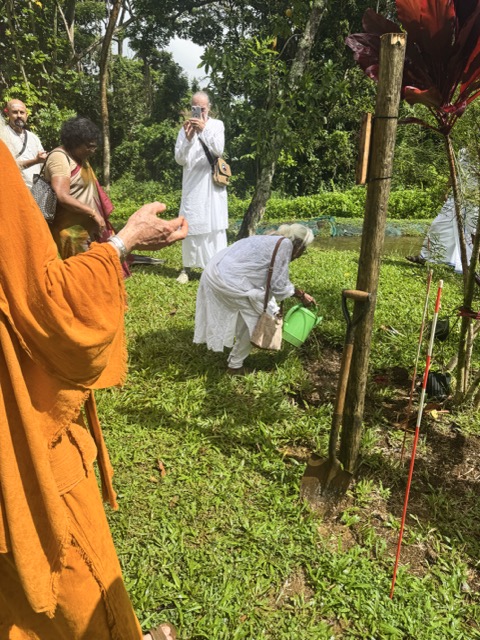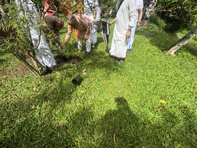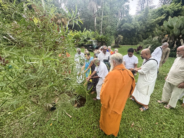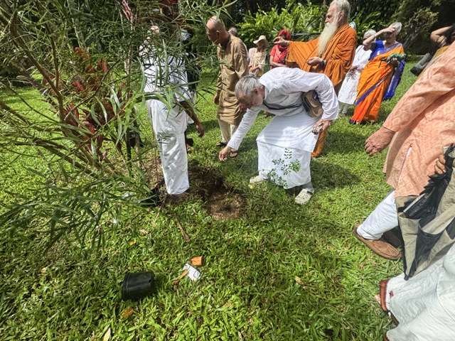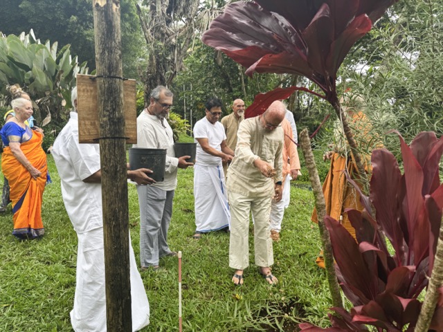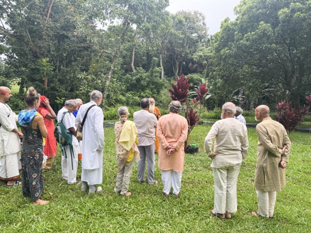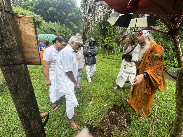 Today we began at 6:00am in Kadavul Temple with another padapuja to Gurudeva, performed by Sannyasin TIllainathaswami and Nirvani Tejadevanatha. Later in the morning, pilgrims traveled out to San Marga with Paramacharya Sadasivanathaswami to plant a sandalwood tree near Muruga Hill, is a small grove in which we intent to have several such trees. The group worked together to add the perfect mixture of soils and to place the little tree in the ground, during which time the clouds opened up for a heavy rain. After the planting was completed, the sun came out and a small blessing was performed for the tree.
