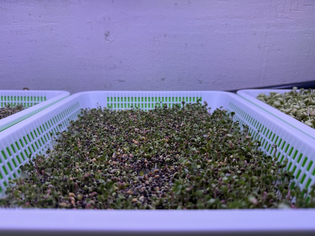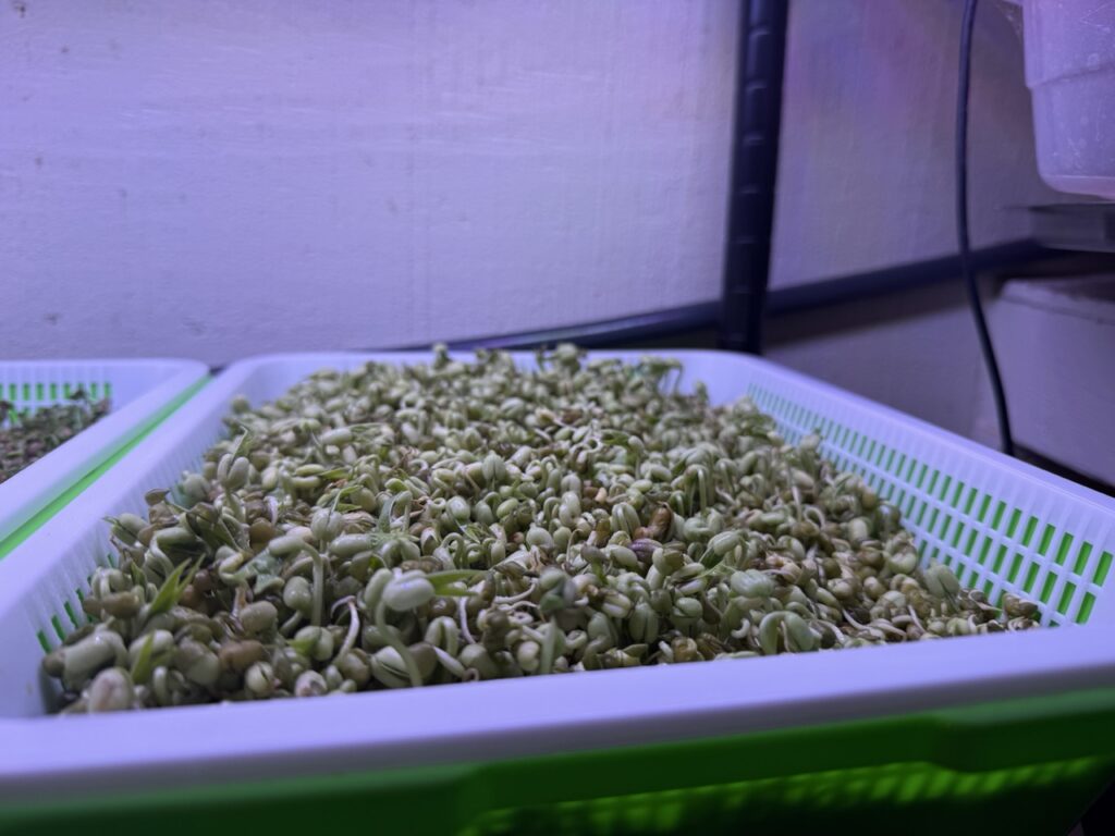 We’ve recently started growing some sprouts in our garden. Mostly we’ll be growing the gold standard of alfalfa and broccoli sprouts. But this first batch is mung micro greens. At this stage of growth, the harder-to-digest compounds are all gone. They get rinsed in a light vinegar solution before serving with food.
