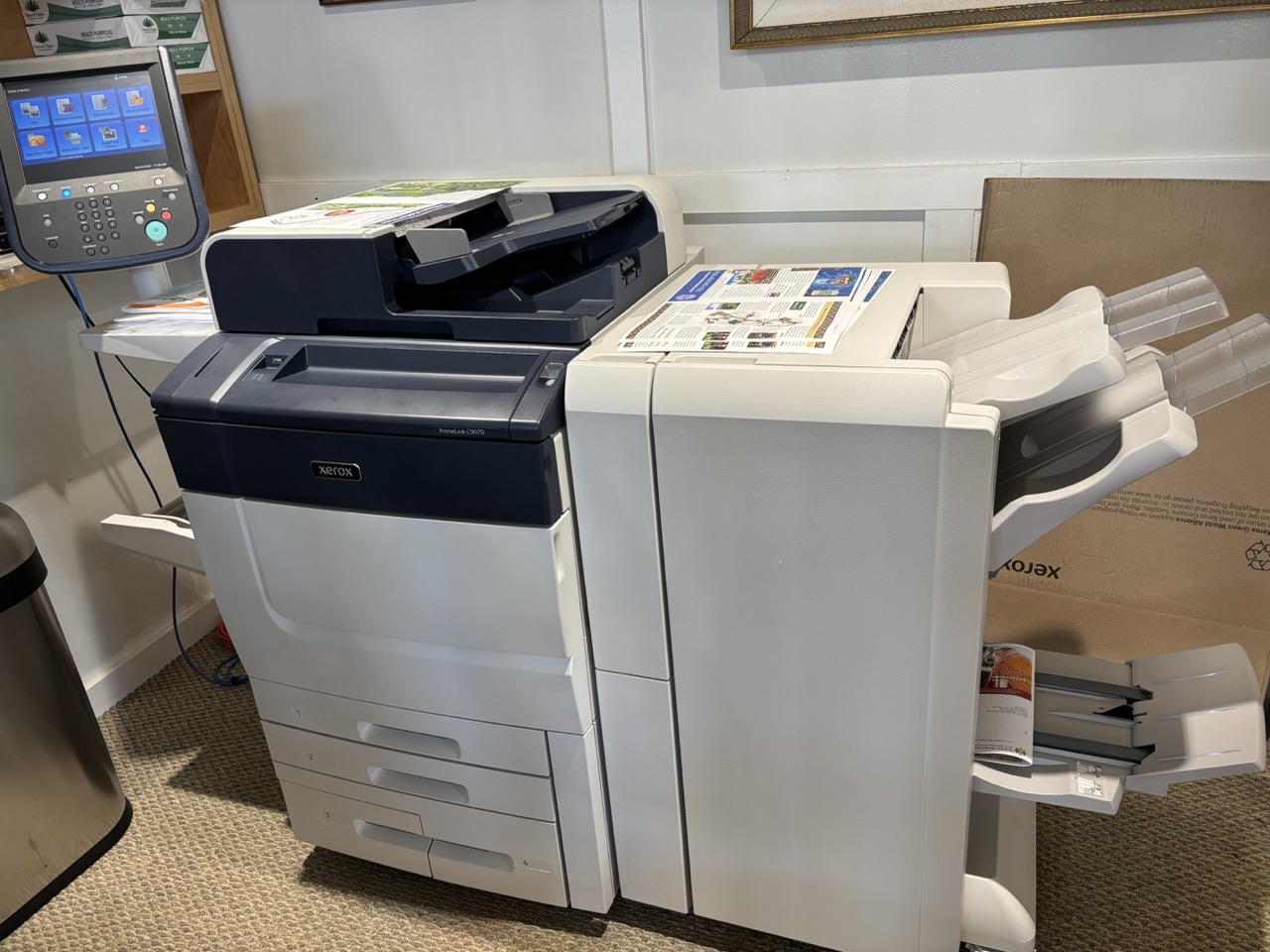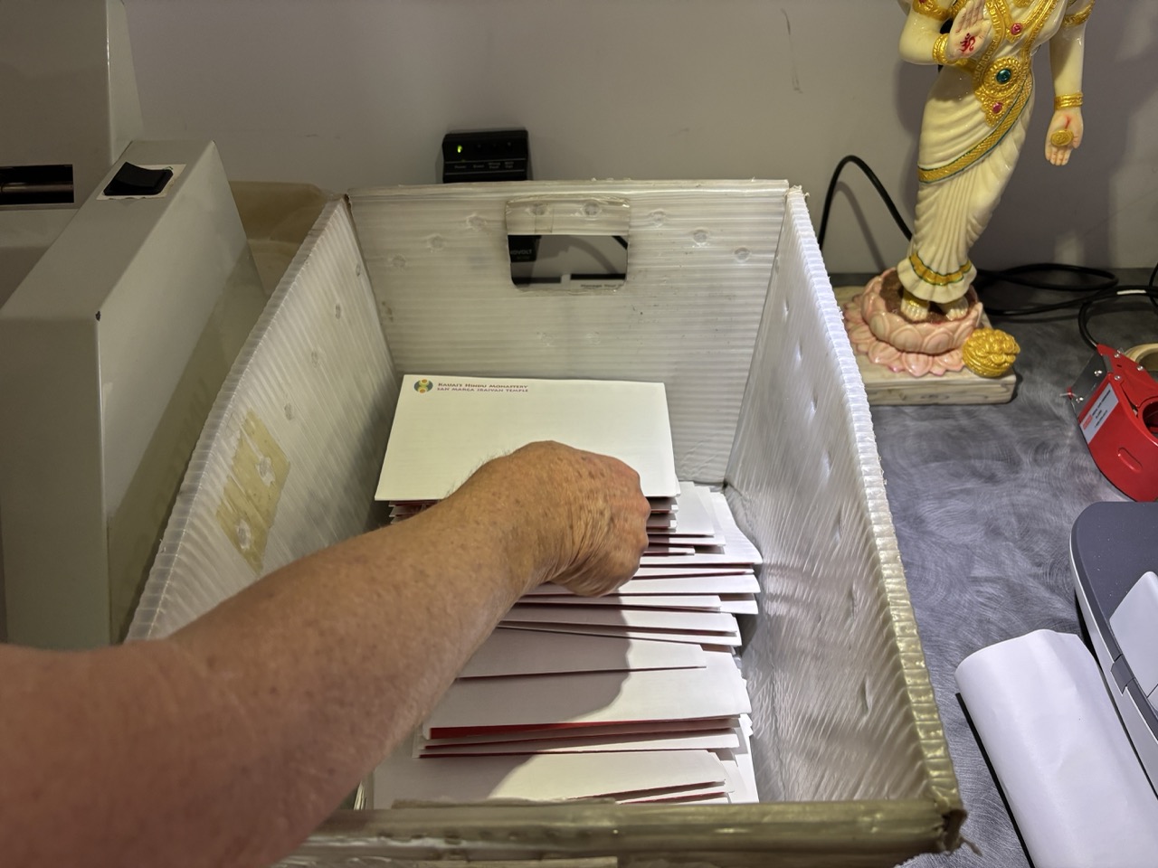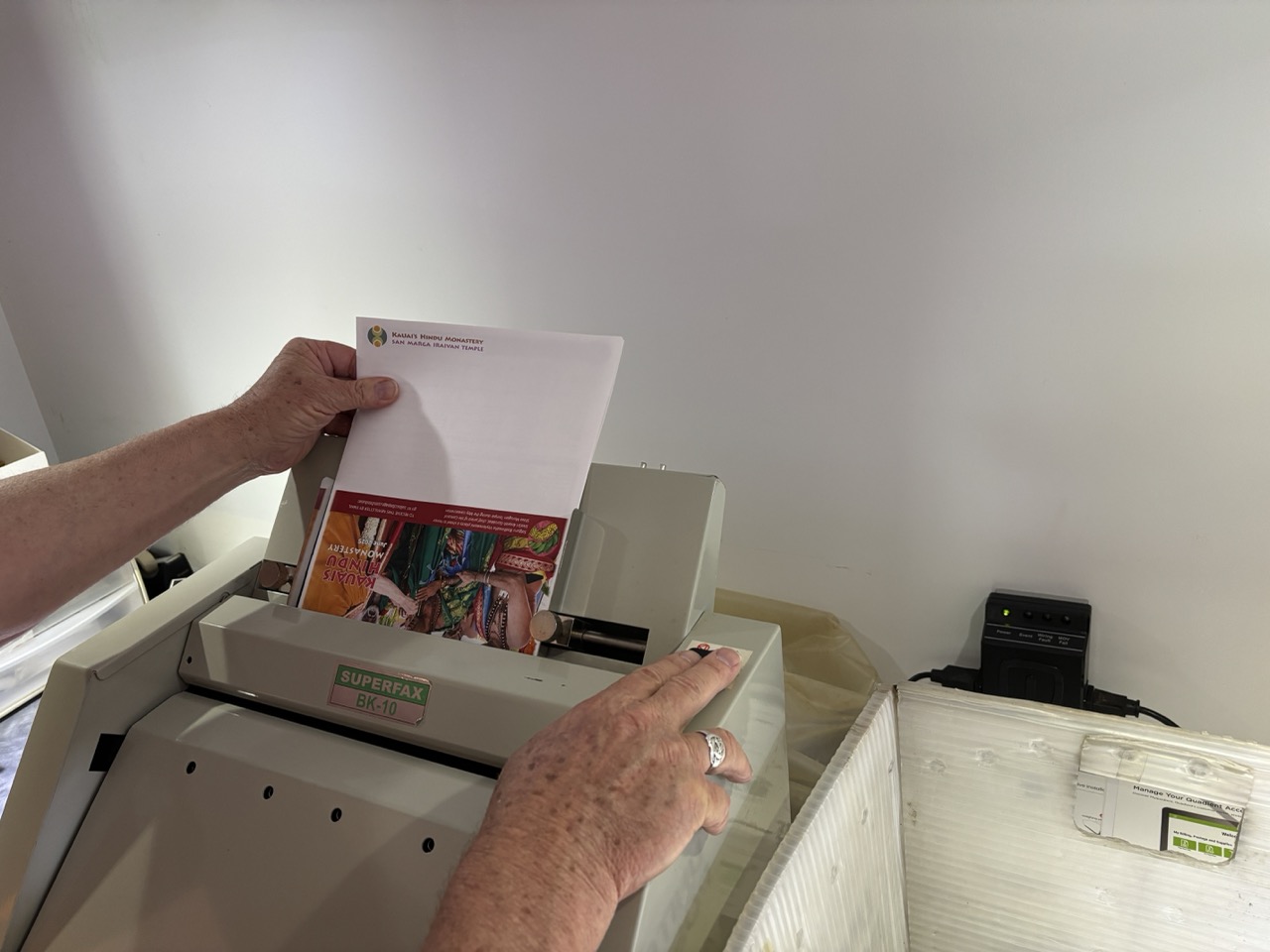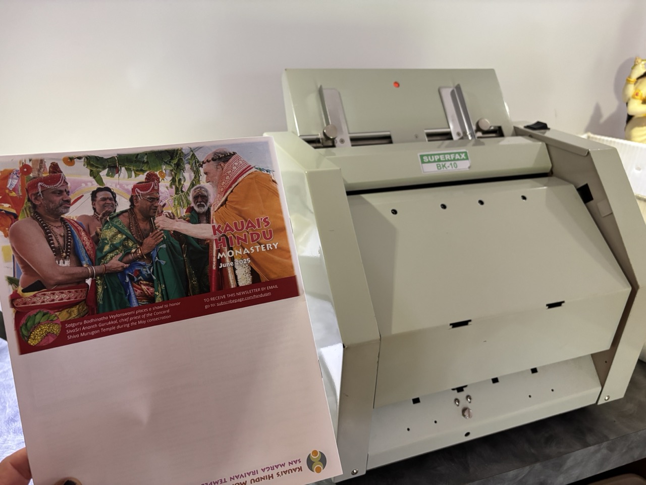 The next Kauai’s Hindu Monastery monthly newsletter wrapped up editing, and now it’s being printed and folded. Today Yogi Haranandinatha is learning how to manage the finicky folding machine. In a few days, many of the monks will gather at our monthly “Iraivan Day” to stuff the newsletter in envelopes along with vibhuti packets.