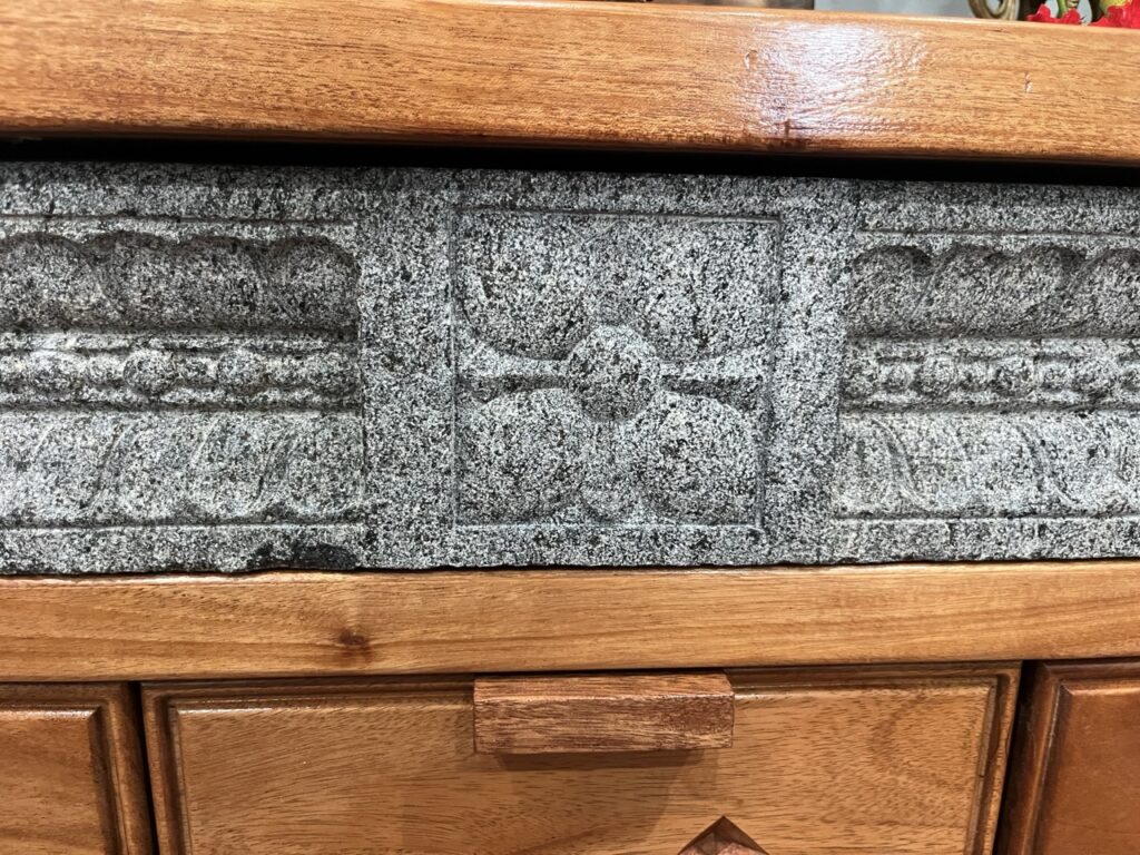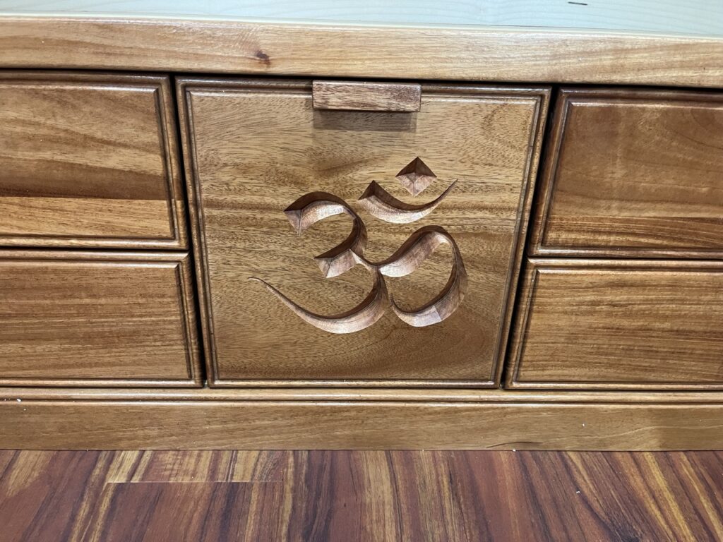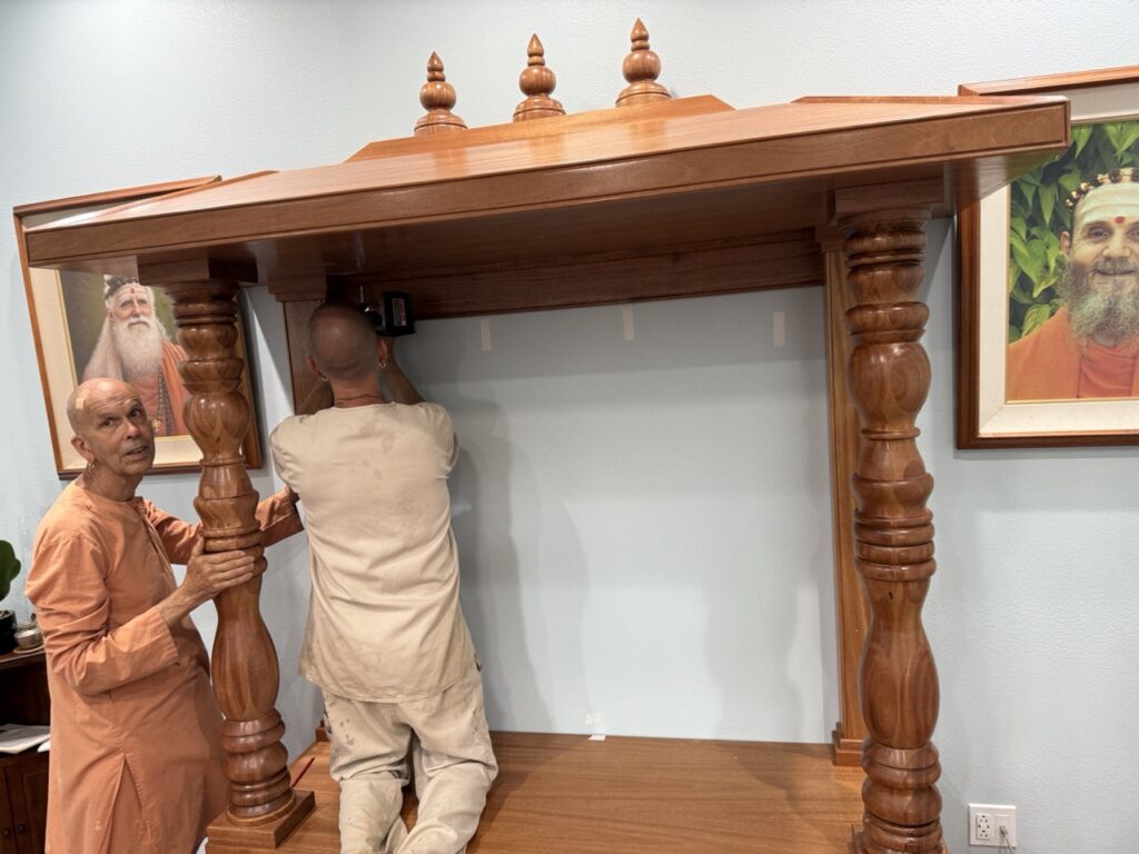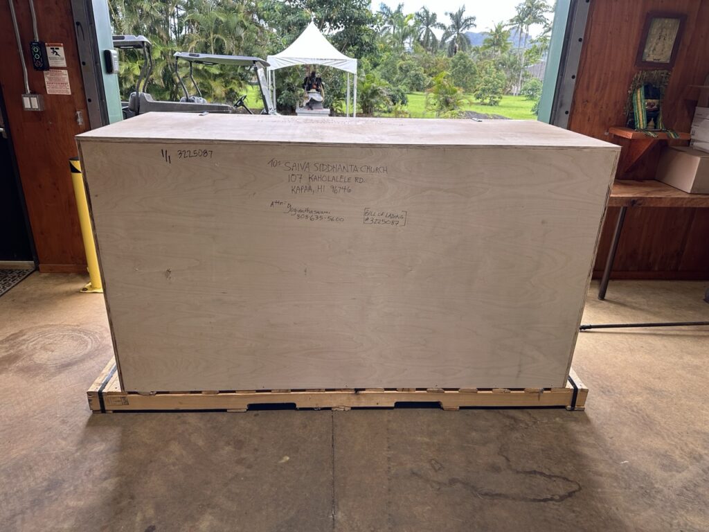 After a year of dedicated work, the shrine was finished, crated and shipped all the way from California to Kauai! It arrived three days ago, and the monks were thrilled to unpack and assemble it. The shrine is truly special, with a carved Aum on the storage drawer and a beautiful section of black granite—which was an extra piece that had been originally made for Iraivan Temple.