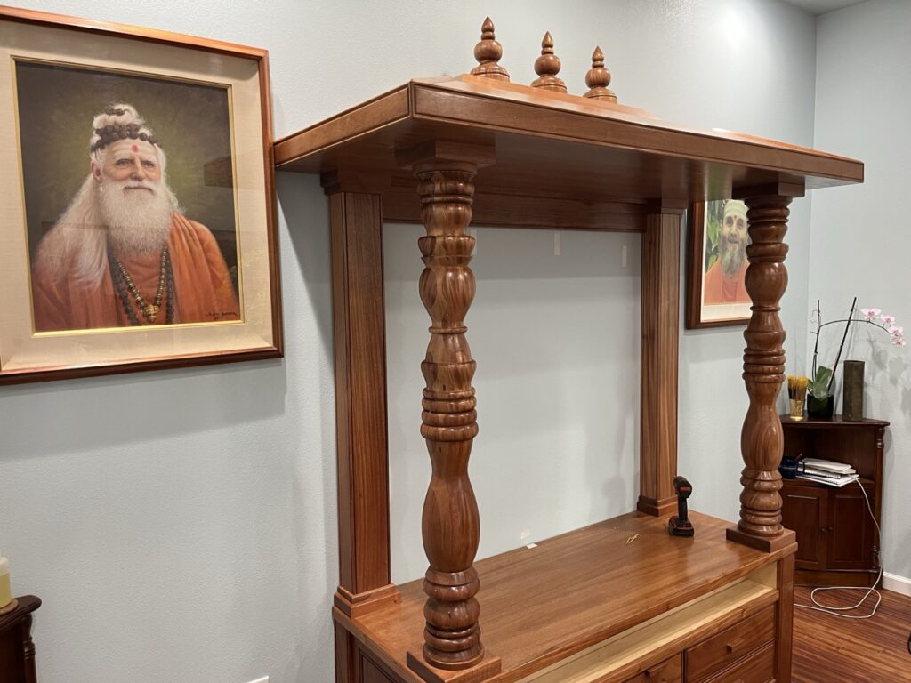 The original concept for the shrine in the Siddhidatta Kulam’s new office, started many years ago after acquired a set of murtis for the new building. The kulam’s monks considered building one themselves or buying a pre-made shrine, but neither option was feasible at the time. That’s when they reached out to Kanda Alaha, a skilled cabinet maker and a longtime devotee of Gurudeva and Bodhinatha. Kanda happily stepped forward to help. With dimensions and drawings from Yoginathaswami, he began constructing the shrine.