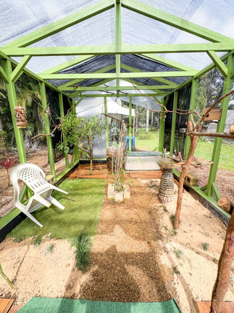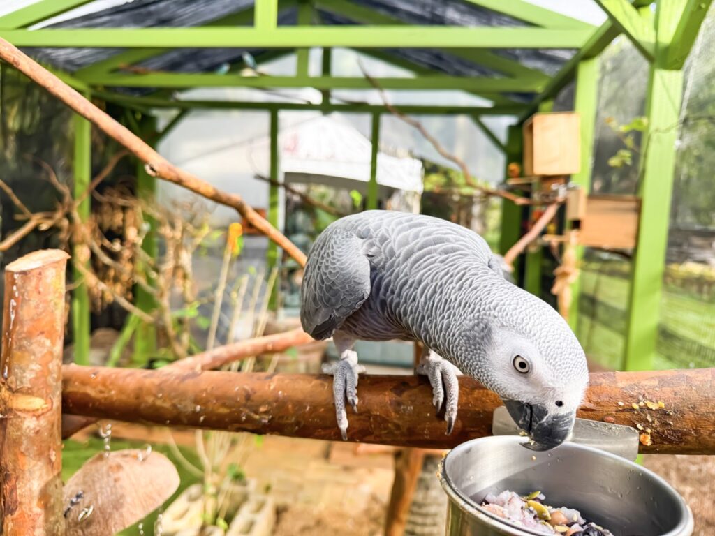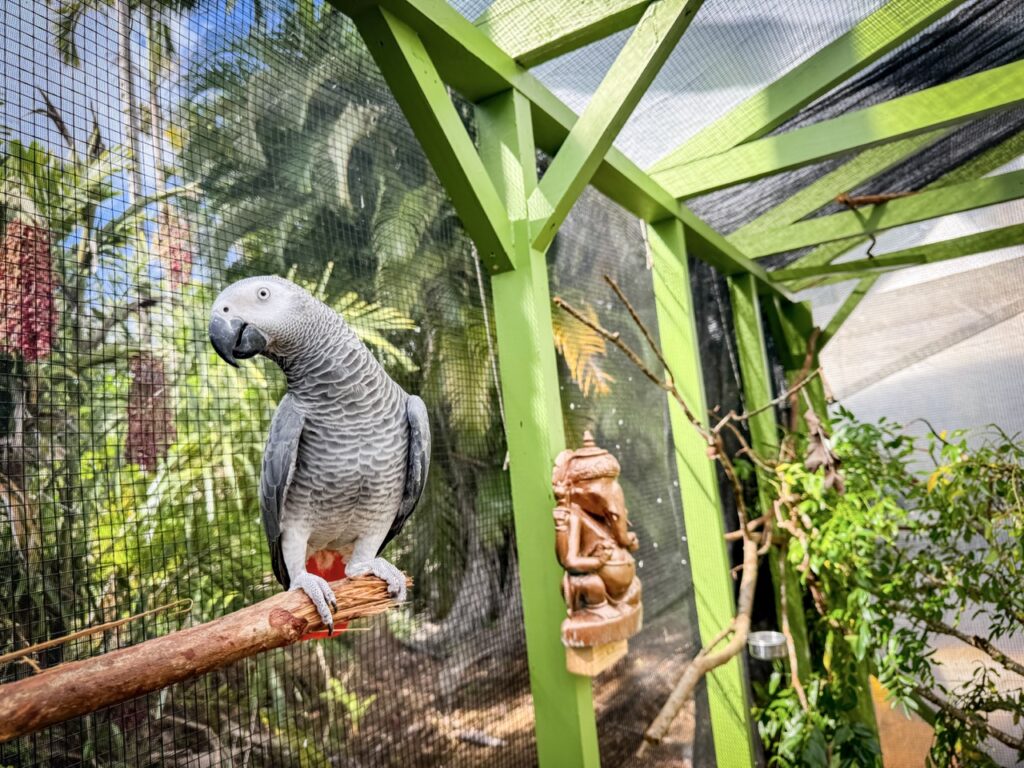 We’re sure most of us are familiar with Nimu, the Monastery’s African Grey parrot. He was gifted to the monastery at three months old, and was raised to adulthood by the monks in the Media Studio. Several years ago, one of the monks had built a small 20ft greenhouse for growing grapes and roses, and over the last half of 2024 it was decommissioned and upgraded into its new form as a parrot aviary. On the auspicious day of Ardra Darshanam, at the end of the year, Nimu moved from his temporary childhood home in the Media Studio, out to this new natural abode—and he LOVES IT!