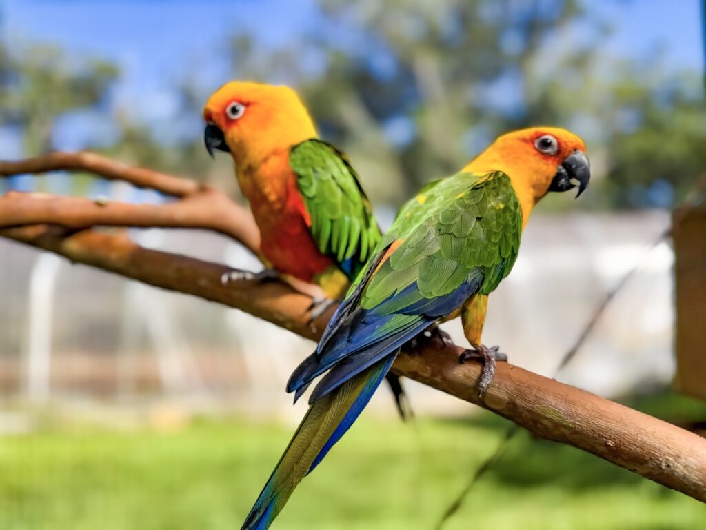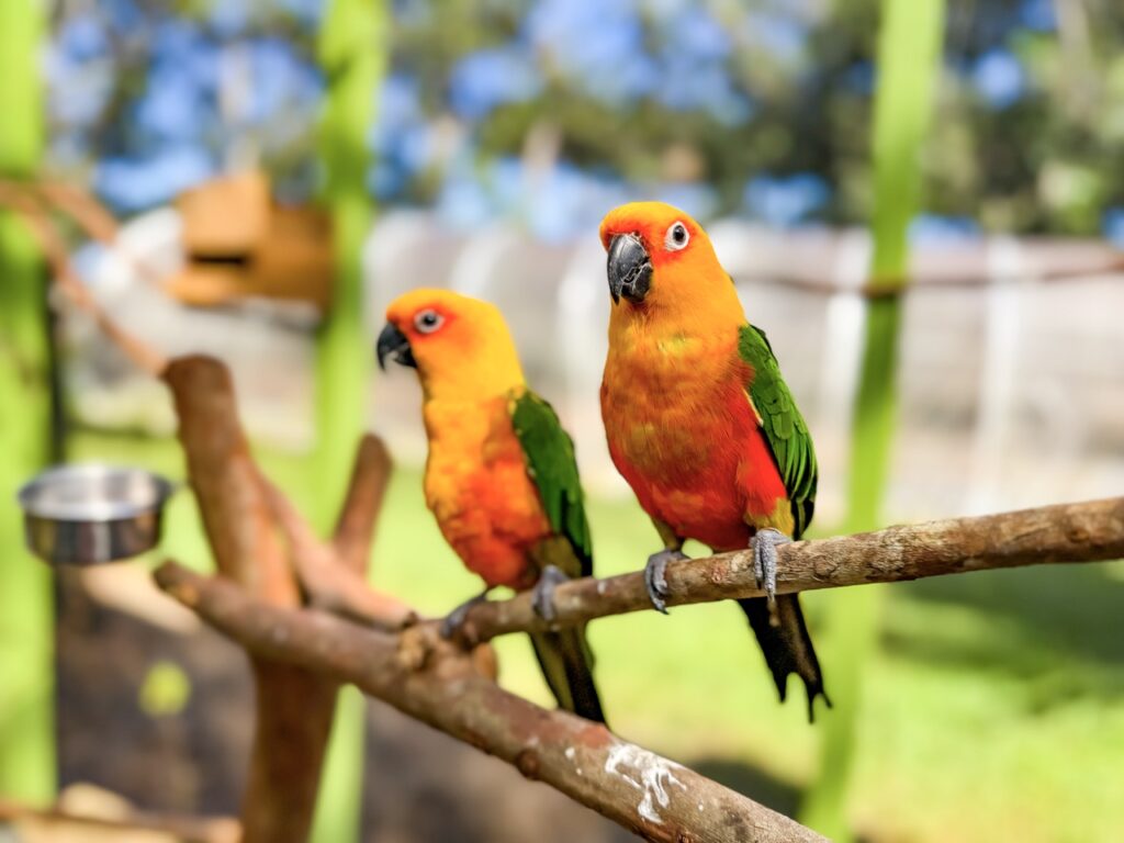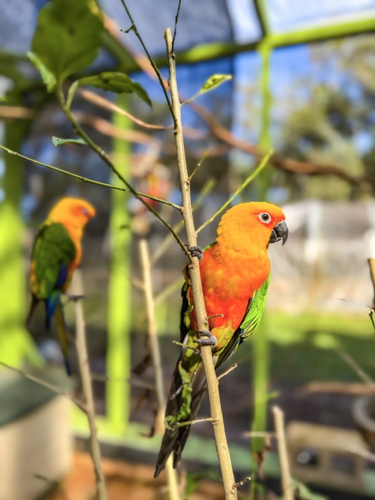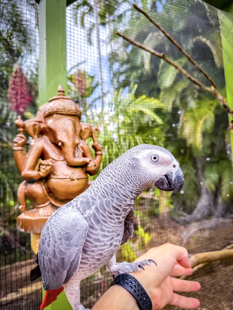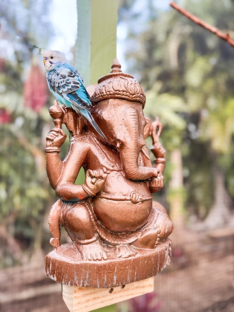 Since the end of last year he’s been enjoying the company of his other feathered friends: a group of blue budgies and a pair of colorful Jendey Conures (they all get along very well). Every day, monks get to visit Nimu’s paradisiacal mosquito-free enclosure to sit with him and supply him with cheek scratches and treats. Monks picking nearby temple flowers like to participate in a complex back and forth of whistling and “Siva Siva.” In contrast to Nimu’s time indoors, he now has loads of sunshine, fresh air, breezy plants and space to fly around. He’s also befriended the wild birds who come to sit on branches nearby to teach him their songs, all of which he has already learned perfectly. At night, he sleeps near a wooden Ganesha, and awakens to a warm sunrise and the squawks of his slightly-batty conure roommates. Aum.