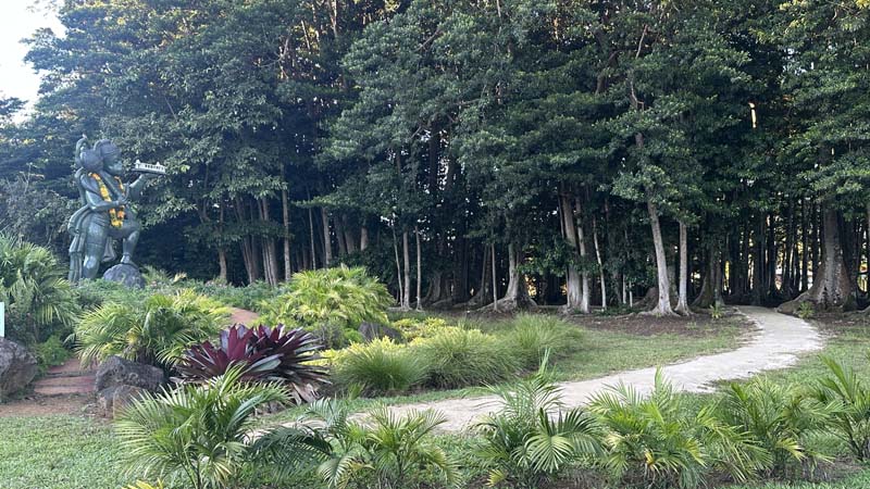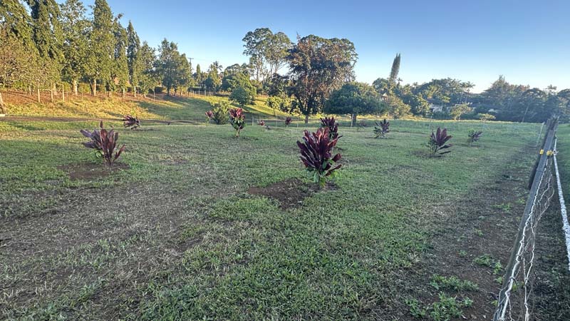 So we flew Nikki back to the valley with the mission to acquire 18 small trees which—after nurturing them in her home for the winter—she packed and shipped to Kauai. They grew slowly at first, but when they realized where they were they took off and became lush and healthy. They were ready to get out of their pots, so we cleared a portion of our cow pasture, put up fencing to keep the cows from making them bovine salad, dug 15 holes (three did not make the journey) and planted them in our finest plant mix. They are settling in, happy to be out near their comrades, the Indian Rudrakshas. In the future pilgrims can visit two rudraksha forests from two nations, and the Mini Mela will have a new offering for pilgrims, grown on the Aadheenam grounds. So, having created a sacred space for future pilgrims, we settle in to mowing the field, fertilizing the saplings, mending the fences and so it goes. Create, maintain, dismantle. Take a breath and repeat.