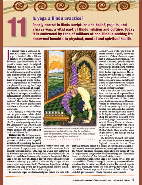 In recent years a vigorous debate has arisen as to whether yoga is intrinsically a Hindu practice or a universal science. The word yoga has changed as the practice moved west. Its original meaning, "union with God," has been replaced with the more secular definition presented by upscale yoga studios around the world that teach a regimen of asanas along with basic breathing and a little meditation. A typical studio ad focuses on the physicality, stating that "yoga increases the circulation of oxygenrich blood, nourishing and detoxifying the internal organs, musculature, cardiovascular, immune, endocrine, digestive, reproductive and nervous systems." The United States alone has over 20 million practitioners, and there are hundreds of millions worldwide. B.K.S. Iyengar, a renowned yoga teacher, gives a more traditional definition on his website: "Yoga is one of the six systems of Indian philosophy. The word yoga originates from the Sanskrit root yuj, which means 'union.' On the spiritual plane, it means union of the Individual Self with the Universal Self." Elaboration: The term yoga actually refers to a wide range of Hindu practices; so it is important to specify what kind of yoga is being discussed. In common modern usage, yoga typically refers to hatha yoga--the performance of yoga postures, or asanas, which are drawn from ancient Hindu scriptures. Hatha yoga has always been performed by Hindus as a preparation for meditation; today, especially in the West, its health benefits commonly supersede the spiritual. Hatha yoga is just one facet of a broader body of knowledge and practice known as ashtanga yoga, which consists of eight stages. (Ashta means eight; anga means limb). The famous Yoga Sutras of Sage Patanjali, who lived around 200 bce, is considered the first systematic presentation of the ancient tradition of yoga. To appreciate yoga's spiritual and religious nature, one need only consider each of its eight limbs, or facets. The first is yama, the ethical restraints; of these, the most important is ahimsa, noninjuriousness. The second is niyama, specific religious observances, including puja in one's home shrine and repeating mantras. The third is asana, the widely practiced hatha yoga postures. The remaining five limbs are all related to meditation: pranayama (breath control), pratyahara (sense withdrawal), dharana (concentration), dhyana (meditation) and samadhi (illumination, or oneness with God). Can those of other faiths benefit from the practice of yoga--without threatening their religion's beliefs? Certainly followers of liberal religious traditions can do so. However, clerics of conservative faith traditions have spoken against its practice for their adherents. For example, in 2008 the leading Islamic council in Malaysia issued an edict prohibiting the country's Muslims from practicing yoga. Council chairman Abdul Shukor Husim explained: "We are of the view that yoga, which originates in Hinduism... destroys a Muslim's faith. There are other ways to get exercise. You can go cycling, swimming, etc." The Reverend Richard Farr, vicar of Saint Mary's Church in Henham, England, commented in 2001: "I accept that for some people it is simply an exercise. But it is also often a gateway into other spiritualities, including Eastern mysticism." The Vatican has issued numerous edicts about the pursuit of yoga. In 1989 it warned that practices like Zen and yoga can "degenerate into a cult of the body" that debases Christian prayer. It is sometimes argued that yoga is not Hindu per se; only the roots are Hindu. The fact that yoga is pursued by many non-Hindus is irrelevant to its validity as a Hindu practice. The roots of yoga, its scriptural origins, are Hindu. The stem of yoga, its practice, is Hindu; and the flower of yoga, mystical union with God, is Hindu. Yoga, in its full glory, is entirely Hindu. Practice at your own risk!