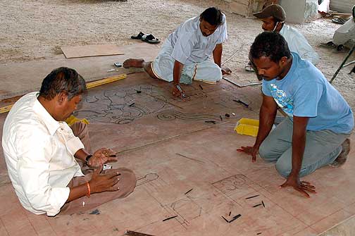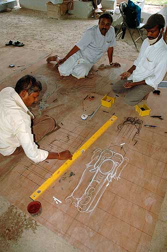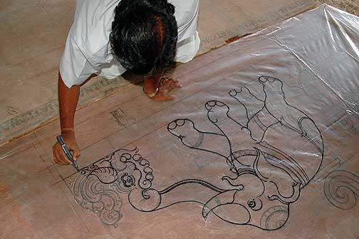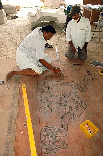And Stapathi marks the same yesti on a piece of tracing so that we can make a cement model from it before carving.