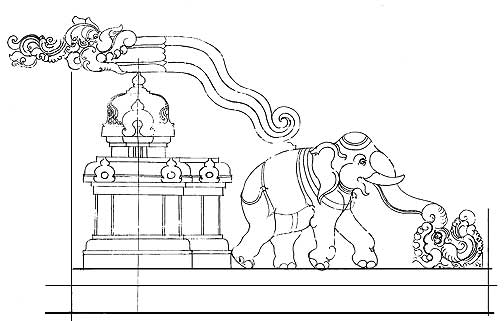 This is the front view of the yesti marked by Stapathi. The one on the left is the view that will be seen from the front. The two separate drawings on the right side is a split view of the front part and the back part. This was done to make it easy to carve, especially the temple which comes behind the elephant..