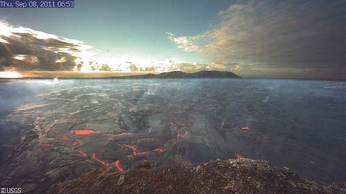 The US Geological Survey's Hawaii Volcano Observatory division keeps constant and very detailed data on the current state of the activity. For the geologically minded among you, or just for a fascinating read you can find out about the nature of the lava tube, it's location, depth and the exact state of things in the last 24 hours here: http://hvo.wr.usgs.gov. They also publish photos daily. Click the photo or this link to see a larger version of the photo at the left.
