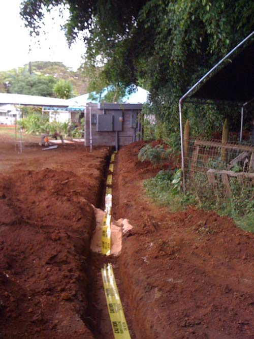 after the first layer of dirt is put back into the trenches, a plastic caution tape is laid in on top. This then is also covered over.