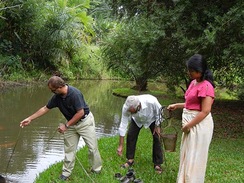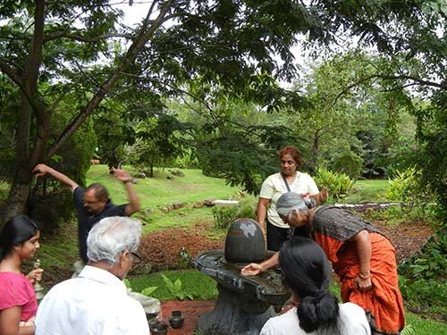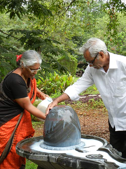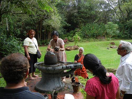 The Kondapi family visited last year but missed doing abhishekam to the outdoor Narmada Lingam, so they were determined to do so this time. Since the water is still not flowing normally in our ponds, they had an adventure to collect water from a pond further downstream