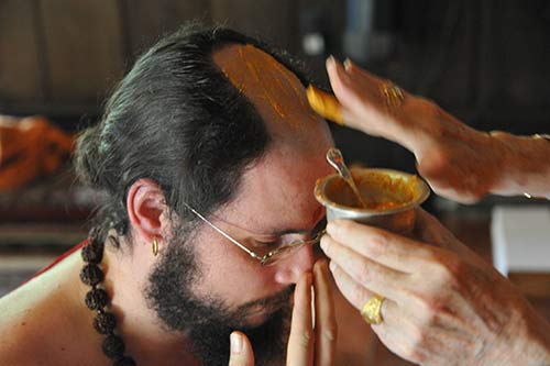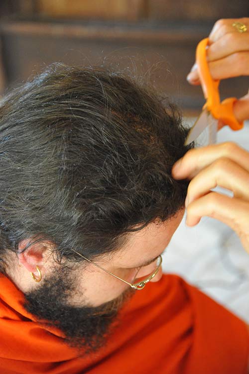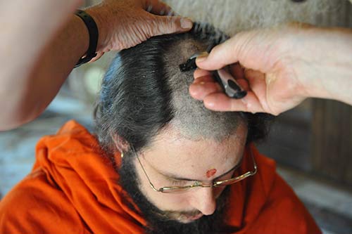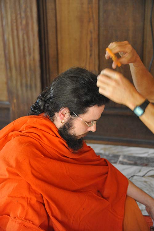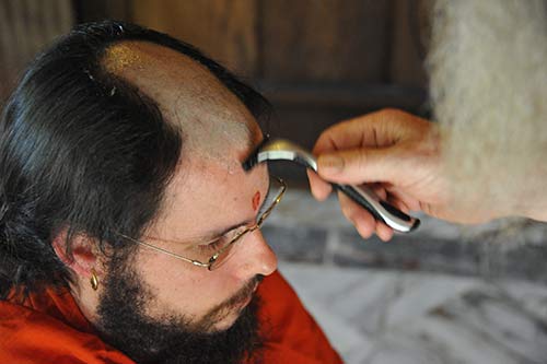 After his sannyas initiation Siddhanathaswami began to let his hair grow. When it became long enough to tie into a kondu in the back it means it is time for his tonsure. Acharya Kumarnathaswami performs the deed.