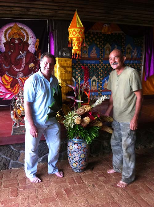 Because our group is so large, this year we will be holding large satsangs in the courtyard, which has been beautifully prepared by the monks. Dasan Mahadevan and Tandu add flowers.