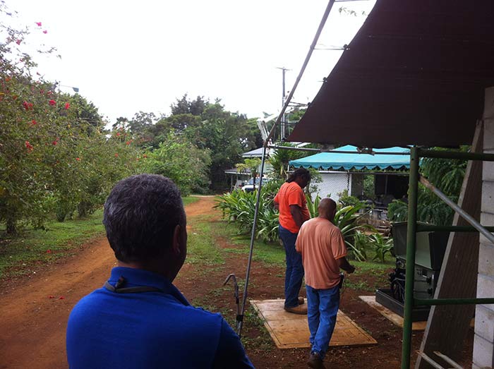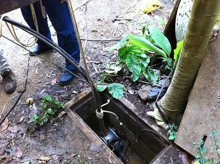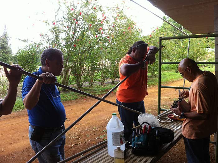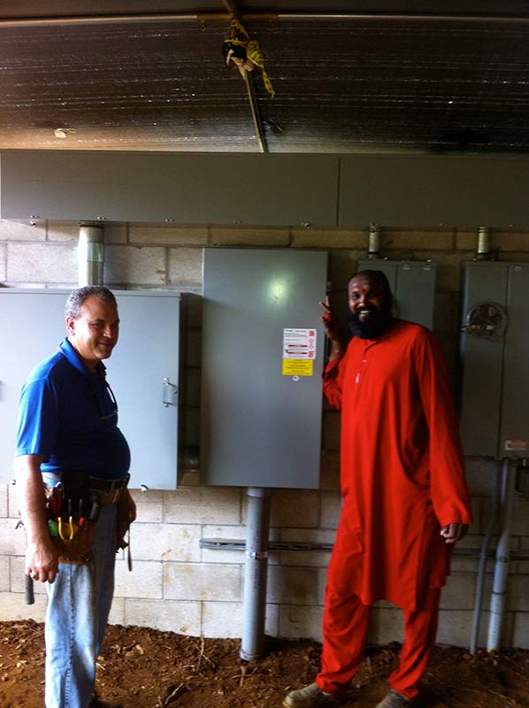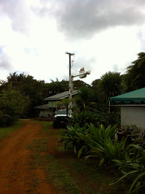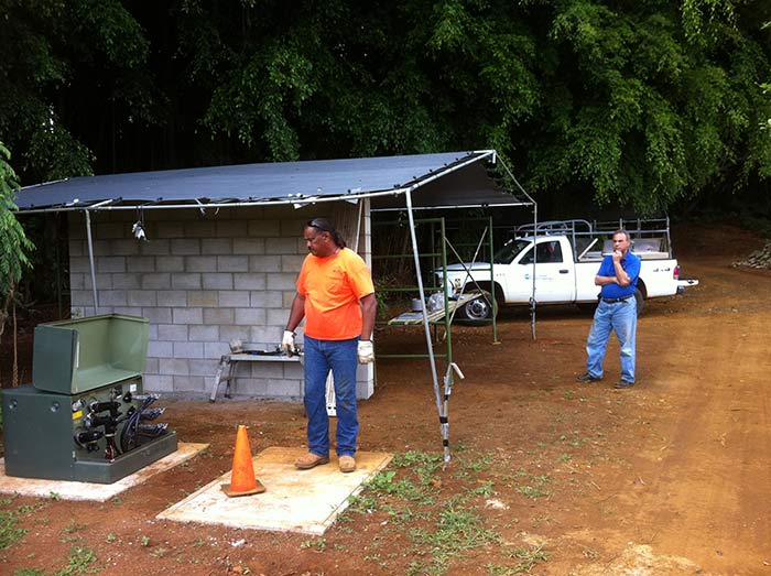 He stands by and collaborates with Kauai Electric Utility company men who are here doing the final hook up of incoming power to the new intake panel recently built.
