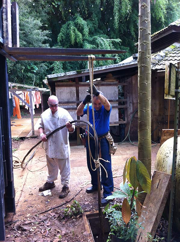 Here he is working on pulling wire through conduit from the distribution shed under the road and over to the Aadheenam.