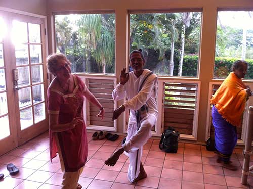 We sat for a while and he took a look through some of our books. Merging with Siva has many small pictures at the start of each chapter. He knew what was depicted on each one "this is saint .... one of the 63 Nayanars and this is his story and why...." And then the next picture. After a brief story of Saint Sambandar we sang the "money bag" song together, the only song I know and my Tamil was pretty good, uh close." We then had our beverages and fruits and while enjoying each other's company he decided to pose and dance as Siva Nataraja and having my wife dance with him.