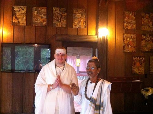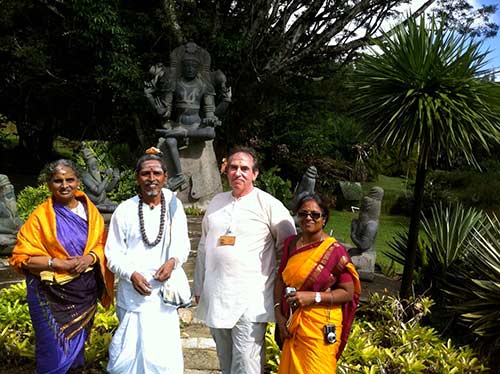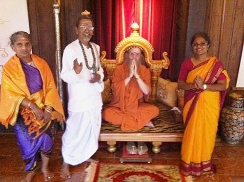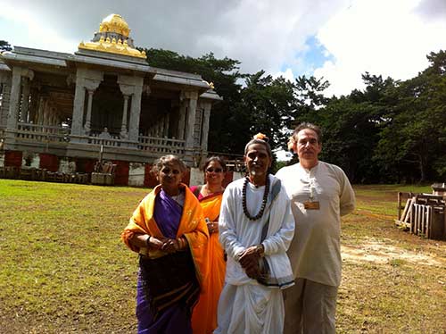 Over this past retreat, we were graced to have with us Sri Parameswara Deekshitar of Chidambaram temple. Deekshitar is the chief priest of Chidambaram temple and brother of Sri Anandanataraja Deekshitar, both of whom were instrumental in welcoming Gurudeva to said temple for the first time in the 70s. After a tour of San Marga Iraivan Temple, Deekshitar (second from left) met with Bodhinatha has did Deekshitar's wife (far left) and family friend Sundari Balaraman (far right).