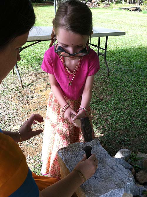 His daughter Bela Sundari, is determined to chip some stone. Her mother holds a chisel as Bela uses both arms to wield the hammer.