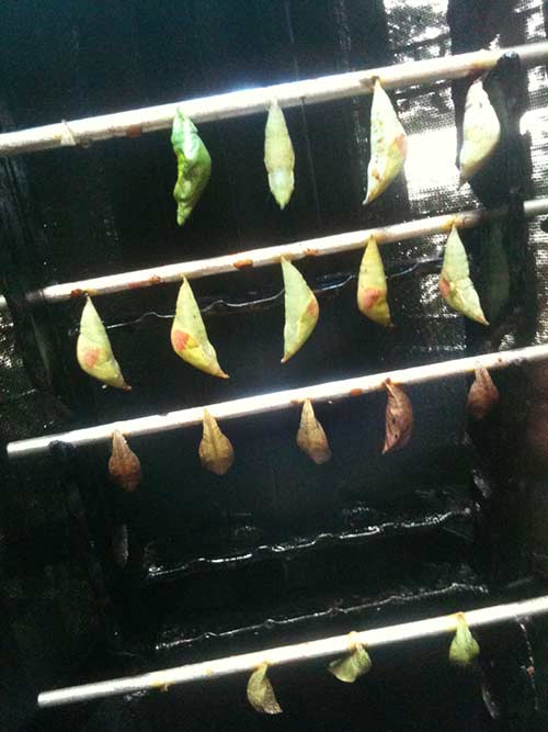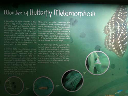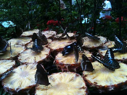 While waiting in Singapore airport for flight to Kuala Lumpur, we visited the indoor butterfly garden. The first photo shows a compartment where you can see pupas growing and preparing to emerge as butterflies. The last photo shows a group of butterflies feasting on ripe pineapple.