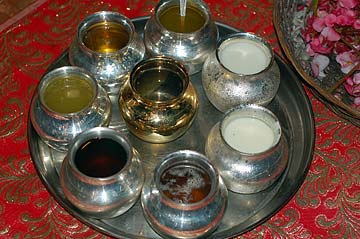 The many liquid oblations for the abhishekam.