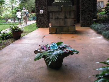 The beautiful turquoise "Andara Crystal" set in the flower bowl at the entrance to Kadaval temple.