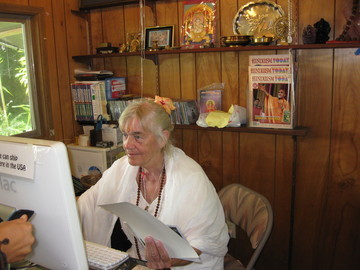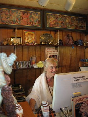 Shama working in the Mini-Mela book and gift shop. Through her expertise on the content of all of Gurudeva's writings and other mystical knowlege, Shama guides guests by answering their sometimes deep philosophical questions.