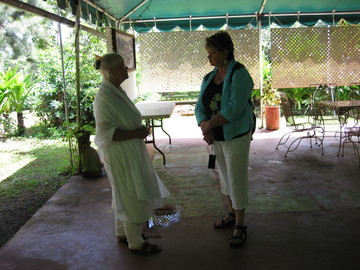 A guest originally from Latvia, asks questions about karma, reincarnation, the Kailasa Paramparai, vegetarianism and the differences between Buddhism and Hinduism. She seemed enthralled with Shama's in depth answers.