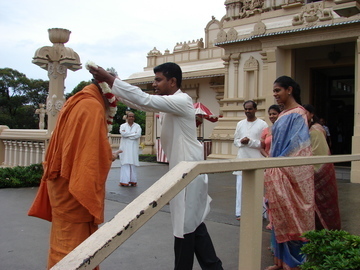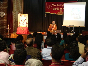 Bodhinatha is welcomed by youth into the Sydney Murugan Temple, where he will give a presentation on the occasion of Youth Day, an event designed to re-invigorate the Sydney Murugan Youth Circle.