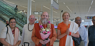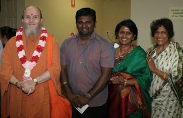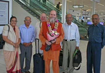 He is met by the President of the Ganesha Hindu Temple in Adelaide, Siva Selvakulalingam (on the right of Bodhinatha), Dr Ravindran, and Prima and Ramani Iyer who travelled on Bodhinatha's 2008 Asian Odyssey Innersearch....
