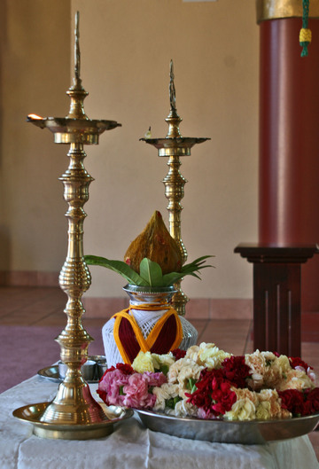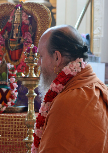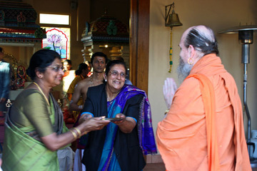 Aarti is given by Sivanes Selvakulalingam and Prema Iyer as he arrives at the temple.