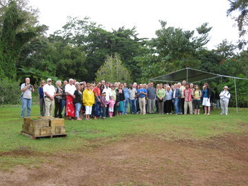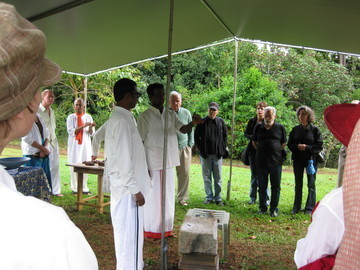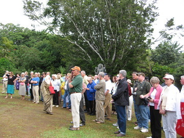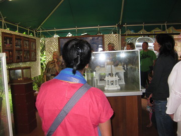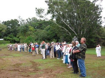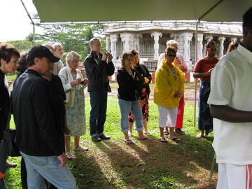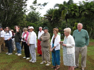 February 20, 2009Today's weekly tour brought over 80 guests to Siva's beautiful botanical gardens at Kauai Aadheenam. Before walking out to see the gardens and temple, Kulamata Amala Seyon explains details of Iraivan Temple project at the sandalwood model and photo display.