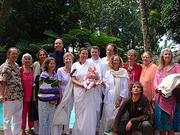 A special baby blessing was given in the Kadavul Temple this morning for Kamala and her husband Bodhichitta who have recently moved to Kauai. They pose for a photo in front of the temple tank with baby Emilia who was born on January 12th. They observed the tradition of keeping mother and child sequestered for 30 days and today was the little Emilia's first trip out in the world. They came to Kadavul for blessings with all their friends.