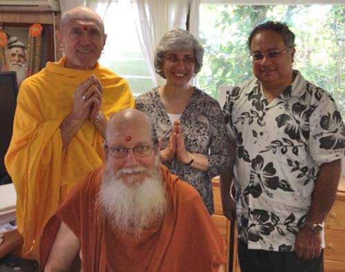 Mr. and Mrs. Clubwalla of New York are long-time devotees and Innersearch participants. They visited us over the past week, as they do periodically. Their sunshine disposition brightens the atmosphere wherever they go. Here, they meet with Shanmuganathaswami and Yogi Jothinatha.