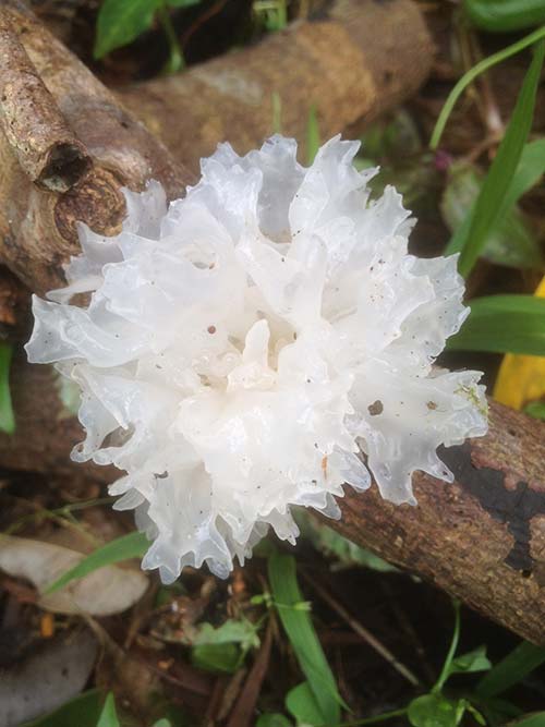 Another addition to our exotic mushroom collection. These tend to appear for a day or two at a time near our Nepalese Ganesha entrance. We refer to them affectionately as our "crystal mushroom." You can see why. Sometimes they are milky, as this one, and sometimes totally clear like glass.