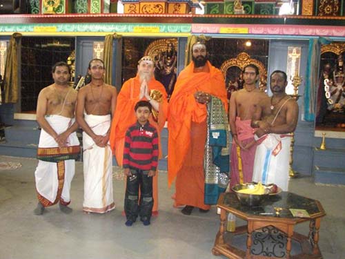 Last February when Bodhinatha was in Bangalore Sivasri Sundramoorthy Sivachariyar told him his brother-in-law had just opened a temple in Canada. He thought it would be great blessing if Bodhinatha could visit the temple. Here Bodhinatha with Sivasri Chandrashekara Sivachariyar (far left) and other priesst from the Bangalore Padasala. He also started a padasala right in this temple to train priesst and teach religion. He invited Bodhinatha to come on a weekend so that he can organize an event for the temple devotees.