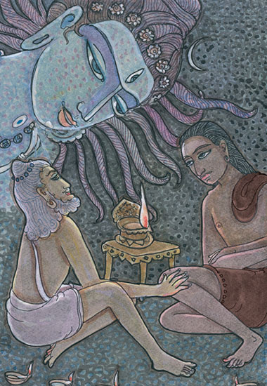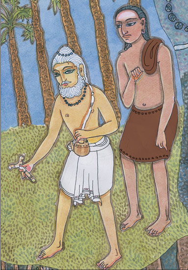 Before the sun came up, they would bathe at a well or river and stretch a bit, then the rishi would sit down facing the east, his shishya nearby. The rishi talked to his disciple for several hours each morning, then sent him to beg the day's meal. They would sleep through the hot hours, and in the afternoon move on, covering a few kilometers each day at a leisurely pace.