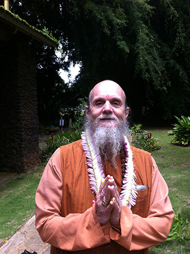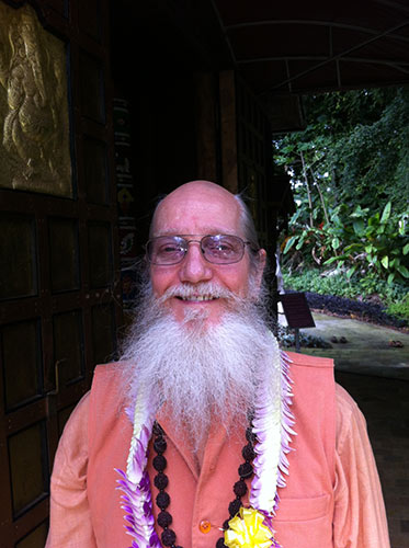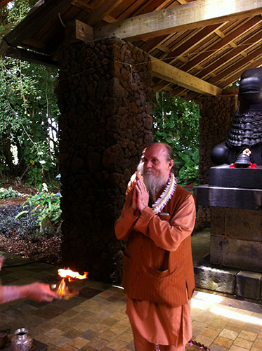 One the first day of our retreat, Bodhinatha and Shanmuganathaswami returned home from their mission to Malaysia and Singapore. Bodhinatha is here being greeted at the temple with arati.