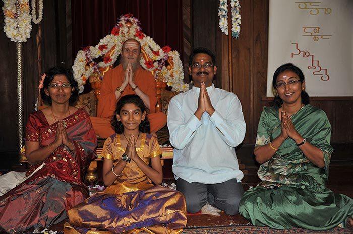 Master Course students Valluvan Veloo (center) with wife Thilagarani and their daugher Kayshana came on pilgrimage from Malaysia for Guru Purnima with Sishya Parimala Selvaraja (right). We snapped this photo on Guru Purnima day.