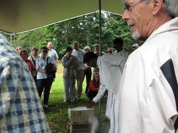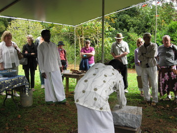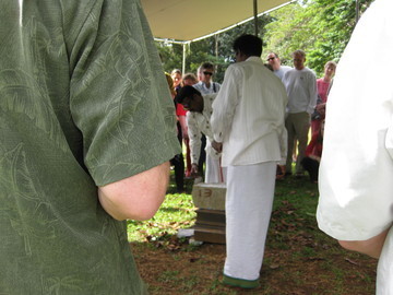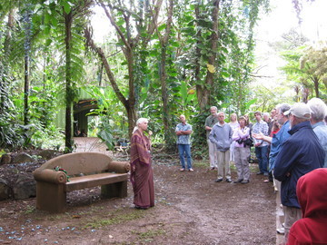 Here beneath the beautiful hanging green jade flowering vines they gather near to listen to the beliefs of Hinduism and ask pointed questions.