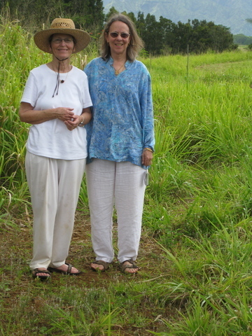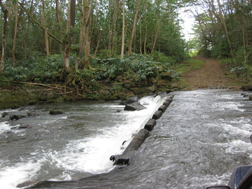 March 21, 2009Kulapati Durvasa Alahan takes care of some of the 300+ acre fields at Himalayan Acres. Recently he invited our guest, Kulamata Savitri Palani on pilgrimage from CA and Br. Lila Devi to ride along with us. The Northeast fork of the Wailua River overflows the concrete bridge crossing.