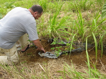 The wild boars dig upthe earth in search of insects.The plastic covers and protects the drip lines watering the newer trees.