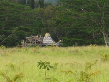 Iraivan surrounded by the lush Kauai tropical gardens with young coconut trees in the foreground.
