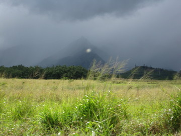 The surrounding mountains are amazing in the distance as the mist rolls in. The unusual flash of light was a surprise in this shot.