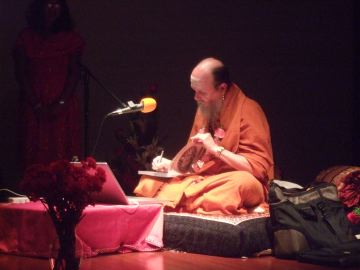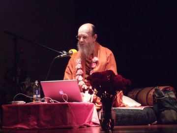 His presentations, developed in Apple's Keynote software, grab the attention of the audience, probably like no other visiting Hindu swami.