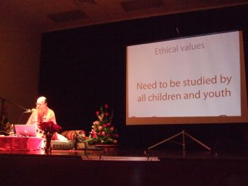Next, Bodhinatha was taken to Midland College for a public talk. About 150 people, Hindus and non-Hindus alike, attended. Bodhinatha spoke on yoga, meditation and enlightenment to a rapt crowd.