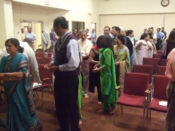 So, why was Bodhinatha in Midland? They have a growing Hindu community, of course! Drs. Mrunal and Padmaja Patel, members of the Hindu Association of West Texas and students of our Master Course Correspondence Study Program, invited Bodhinatha here to speak at the temple and local community college and to hold satsang in several homes. Here, he speaks at the temple.
