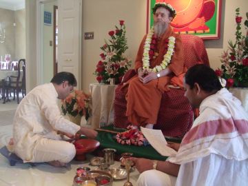 The following day, the Patel family brought Bodhinatha to their home for pada puja and satsang. The priest of the HAWT temple, who Bodhinatha knows previously from the Kasi Vishvanatha Temple in Flint, Michigan, guided Mrunal Patel in the puja.